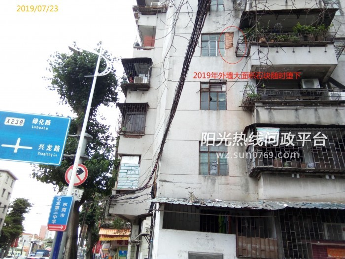 三年前反应过的问题 石龙镇第三中学,学校门前的育才街西面出口处的铁路宿舍南面外墙有空鼓_阳光热线问政平台 http://d.wz.sun0769.com/index.php/question/show?id=300726 三年后,台风季节来了,石龙镇第三中学出口处的铁路宿舍外墙已经出现严重脱落的现象,大面积石块随时堕下,极度危及学生安全。请看图。 希有关部门加紧处理,给学生们一个安全的环境,谢谢。。