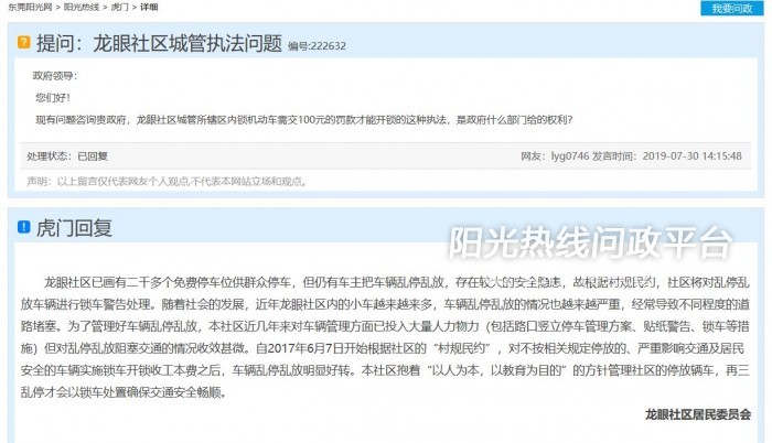 针对上次投诉龙眼社区城管锁车交罚款回复的建议