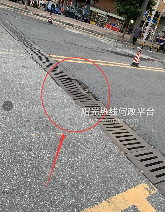 牛山牛头村景怡路入口处,收费处对出地方。如图。已损坏很久,且位于入口中间,车辆一经过就掉下去!请尽快处理,谢谢!