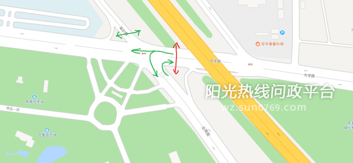 尊敬的松山湖交警大队:自从环湖路-大学路口进行安装隔离石墩后,从环湖路(大学路)往台中路的拥堵得到缓解。但产生了一个新问题:环湖路往大学路方向新增了右转箭头灯,和人行道灯相位相同,影响行人安全。同时,该绿灯时间短,导致车辆排队过长。建议将环湖路右转箭头灯相位修改:环湖路右转绿色箭头灯调至与大学路由东向西绿灯相位相同,这样有两个优点:(1)该时段是大学路往西行驶绿灯,两边同时放行,车流无交织,且该时段最长,有利于疏散右转车流。(2)该时段人行道为红灯,有利于行人安全。