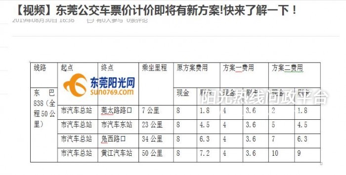 在听证会上贵委以东莞巴士838路为例,全程50公里,从市汽车总站坐到莞太路路口,里程7公里,按现行方案,费用付现金要8元, 反向就是2元,对从从市汽车总站坐到莞太路路口乘客不合理。 方案一:按线路里程实行统一票制,具体如下:24公里(含)以下的线路票价为2元/人次;24-36公里的线路票价为3元/人次;36公里以上的线路票价为4元/人次。 方案一,长途乘客从市汽车总站到黄江车站从8元降到了4元,长途旅客很好。但从市汽车总站坐到莞太路路口,还是从反向的莞太路路口到市汽车总站都是里程7公里(24公里以内),方案一票价应该是2元,图片中的4元是怎么回事,贵局能解释下吗?(图片来自东莞阳光网新闻内) 如果最后采用了方案一,我想问下贵委对持外地有“交通互联”标志公交一卡通也是适用方案一收费吗?还是像原来的无论乘坐24公里以内还是50公里都一律收取4元全程费用吗? 以上两个问题希望东莞发改委给予解答,同时也希望新的收费方案尽快实施?