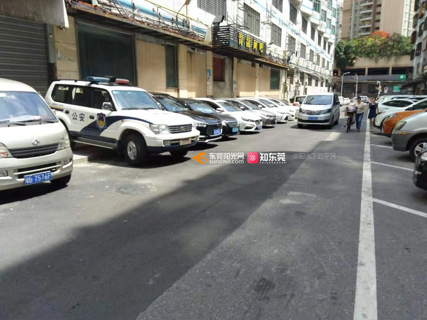 如果这条路停车算违章,我建议设立一组人专门在这条路开单,保守估计停有100台,加上流动的,算1天150台,150*200*365=1095万,你们一年可以创收约1100万。(下图警车也是停在这罚款的路)