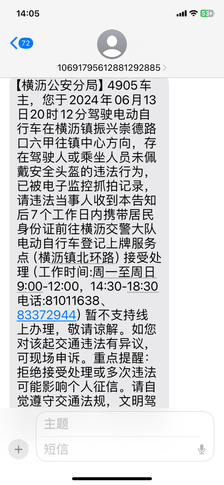 本人一直生活出行主要在石龙和石碣两地,这一年来从未去过横沥, 却收到横沥公安的电动车违规短信,内容如附件. 我查是我原始的一辆电动车,车牌974905,旧车早已卖给车行,通过1212交警电动车系统过户, 而且我看到你们是车牌再利用,已签发给了新车主. 为何系统还没有变更我的联系方式呢?请横沥公安交警处理一下, 联系新车主处理违章. 谢谢