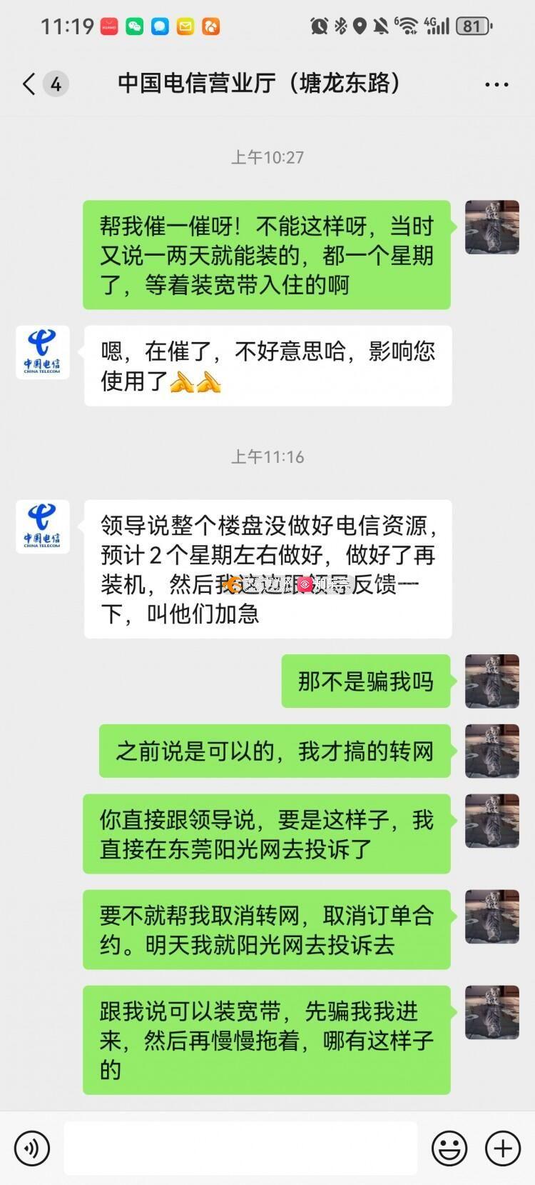 本人于9月11日咨询电信营业厅(东莞塘厦塘龙东路营业厅),本人所在小区是否可以报装电信宽带网络,回复可以安装。13号去到营业厅现场办理携号转网,同时报装宽带,现场工作人员告知1-2天安装,装维人员也是电话上告知可以2天后安装,本人便办理了该业务,现场缴存200元套餐费用和200元安装费用。到目前一个星期了,多次催促无果,今天更是直接跟我说小区目前没有电信宽带资源,无法安装宽带,要2个星期后才可以。 这是赤裸裸的欺骗行为,没有宽带资源,暂时不能安装应该当场跟我说清楚,而不是先骗我携号转网过来,让我签了合约套餐,多次催促后才跟我说要再等半个月后才能安装,套路客户! 目前199元的套餐费用已缴存,按照合约内容是包括了1主卡4副卡电话费用,宽带费用和电视费用,目前只有1主卡和1副卡能使用套餐优惠,其他手机号要等宽带开通后才能使用套餐。这样损失谁负责? 本人要求东莞电信3天内把宽带开通完毕并且能正常使用,否则退回400元费用并且取消所以套餐合约!!