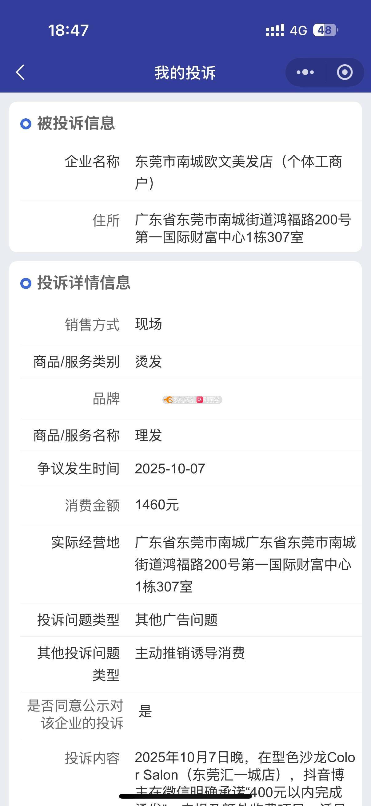 2025年10月7日晚,在型色沙龙Colo r Salon(东莞汇一城店),抖音博主在微信明确承诺“400元以内完成烫发”,未提及额外收费项目,诱导本人到店消费。以“店长私人定制设计”为由收取高额费用,但实际服务主要由其他店员操作,店长未实质性参与关键操作;服务内容与美团平台同款团购套餐(价格约400元)高度一致,却收取1460元,另收会员费二者共计2200元,740元已退回给本人:违法依据《价格法》第十四条:经营者不得利用虚假或使人误解的价格手段诱骗消费者(如未提前告知分区/分项收费)。 《消费者权益保护法》第八条、第二十条:消费者享有知情权(未获知真实服务内容与价格);本人诉求退还差价1060元(1460元-400元合理成本);依法调查该店虚假宣传行为;
