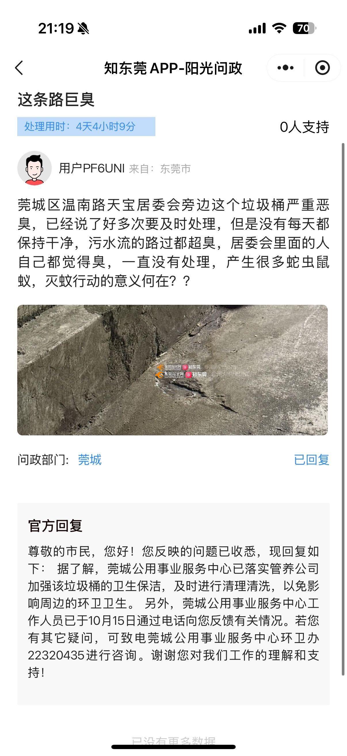 受理了几天过去,说好了解决方案,但是并没有落实,地上污水已经从黑变白变黄,垃圾袋也没套上,是想等下雨的时候冲洗这块脏地吗?旁边居委会不是要严格执行灭蚊行动吗,难道看不到门口有苍蝇蚊虫吗?