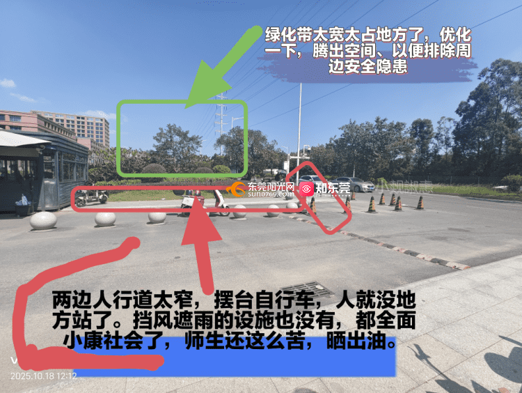 领导您好!麻涌嘉荣学校,现已顺利招收三届学生,在校生规模持续扩大,上下学时段家长接送车辆骤增,导致学校南门门口交通拥堵、配套设施不足等问题日益突出,不仅影响师生及家长的出行安全与便捷,也对周边交通秩序造成一定影响。请上级部门协调该校改善这一现状! 1. 增设遮风挡雨设施:学校南门口目前无任何雨棚、遮阳棚等基础便民设施,家长接送孩子时需直面日晒雨淋,师生家长体验很差。建议在门口等候区域加装,连片式遮阳挡雨棚,兼顾实用性与安全性。 2. 科学扩容停车空间:现有电动车、自行车停车位数量远无法满足接送需求,部分车辆只能随意停放,加剧人行道和机动车道交通拥堵。人流不断溢出到水乡大道机动车道上,十分危险。水乡大道大型货柜车、泥头车出入频繁,存在严重安全隐患。建议对校门口过宽的绿化带,进行精细化改造,合理缩减部分非必要绿化面积,新增标准化电动自行车停放区域,并配套建设遮阳挡雨连廊。 3. 完善南门人行道停车规划管理:建议制定系统化的人行道停车管理方案,通过划定清晰的停车标线、设置导向标识,明确车辆停放区域、进出路线及行驶方向,引导车辆有序停放,缓解接送高峰前交通压力,为师生及家长营造安全便捷的出入环境。有效降低安全隐患,保障学生通行安全。 孩子的出行安全与校园周边环境的有序运营,是社会各界共同关注的民生问题。恳请贵部门高度重视上述建议,尽快组织实地调研,推进相关优化整改工作。感谢贵部门长期以来对教育领域民生保障工作的支持与付出!