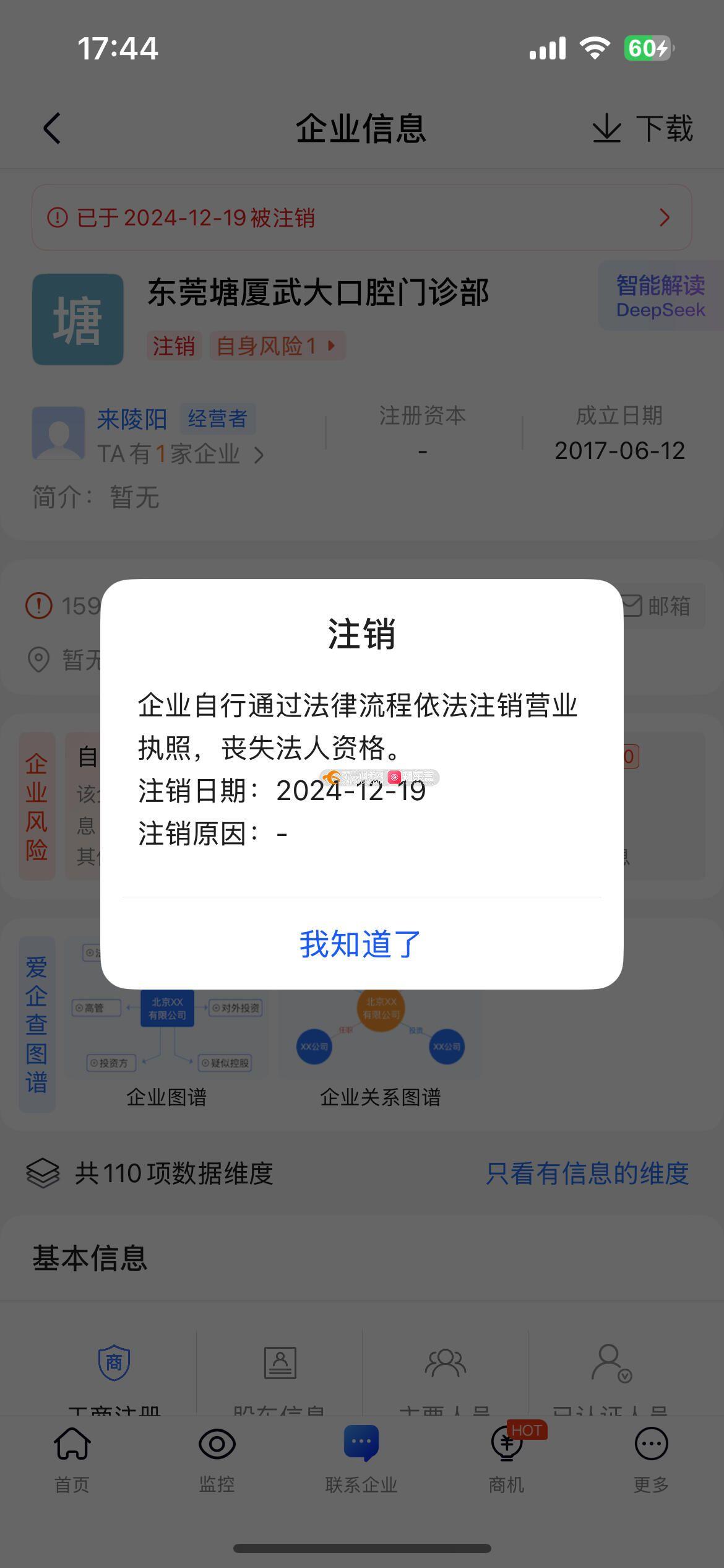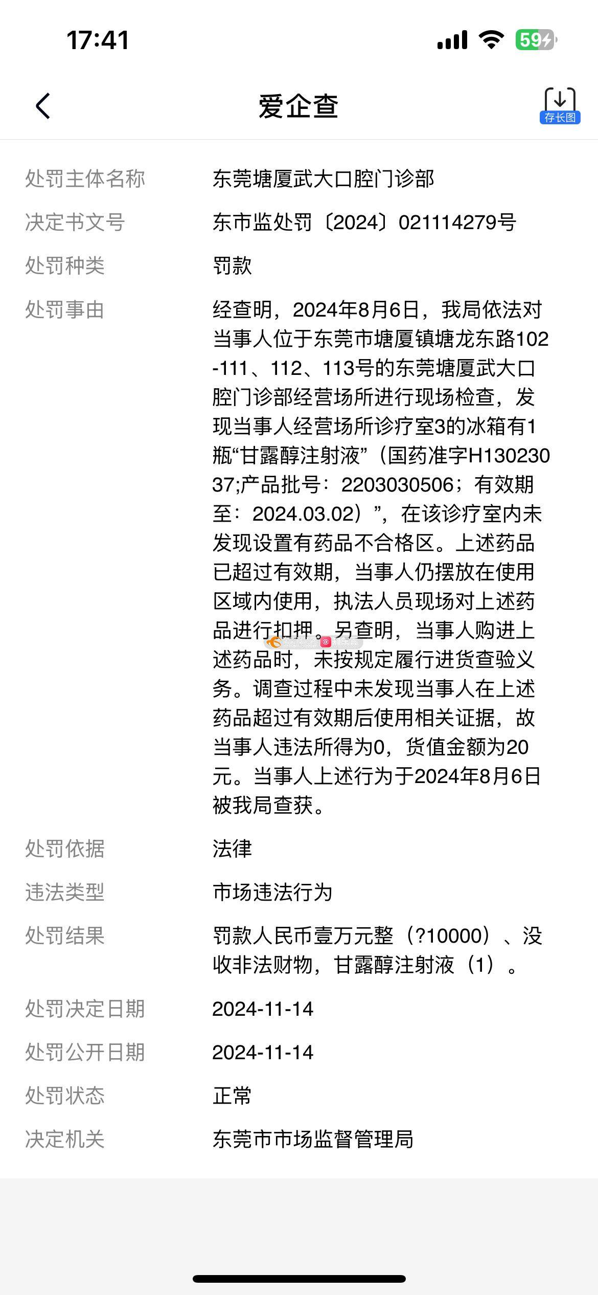 公司主体:东莞塘厦武大口腔门诊部 行政处罚:于2024年11月14公开了关于使用过期药物的行政处罚。 该公司立马于2024年12月29日进行了注销。 问政诉求: 1.该公司是否已履行了2024年11月14的行政处罚,是否已缴纳罚款。何时缴纳的,请提供凭证。 2.该公司具体注销的原因是什么? 3.该公司为什么在信用中国里查询不到记录 4.该公司注销后其名下的《医疗机构执业许可证》 行政许可编:PDY20165544190019D1522是否还有效? 5.备注:附件信息截图均来自爱企查APP(为方便体现公司名与许可内容在同一页体现)本人确保如下截图信息与国家企业信用信息网的信息一致(已录制视频)。