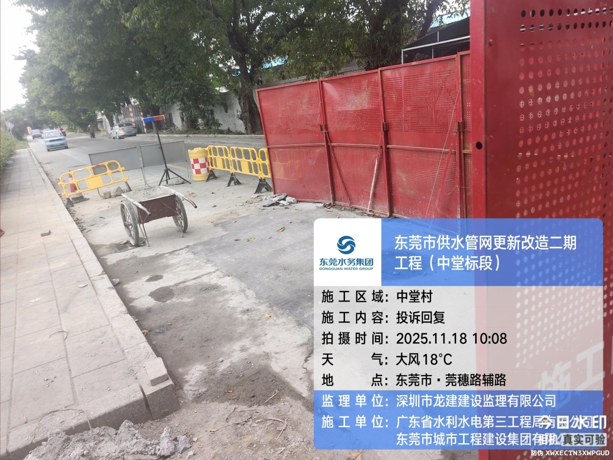 尊敬的市民,您好!您反映的问题已收悉,现回复如下: 收到反映的情况后,我们于2025年11月5日16:42电话与您取得联系,并对诉求进行办理。您反映问题的工程为东莞市水务环境投资控股集团建设管理有限公司(下称“建设公司”)负责代建管理的东莞市供水管网更新改造二期工程中堂标段,施工单位为广东省水利水电第三工程局有限公司和东莞市城市工程建设集团有限公司。 关于您反映的施工问题,您反映的路段于2025年9月18日开始施工,9月26日由于供电公司要求施工单位出具物探报告同时要求停止施工,停工期间为方便市民出行撤除围蔽。10月31日供电公司同意恢复施工。目前,建设公司已要求施工单位科学合理安排施工工序,全力加快路面恢复工作进程,施工单位已于11月17日浇筑混凝土,预计11月20日完工撤除围挡恢复正常通行。施工期间给您造成不便,敬请谅解。 2025年11月18日,工作人员致电告知您上述情况。如有疑问,欢迎致电水务环境集团24小时客服热线96968,感谢您对我们工作的理解和支持!