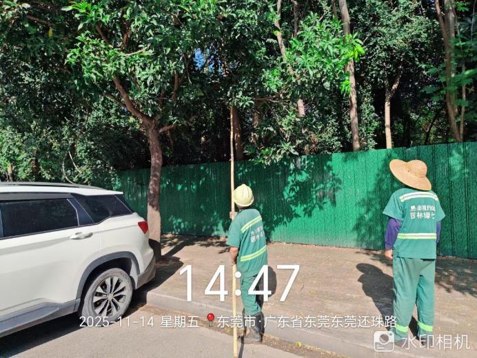 尊敬的市民,您好!您反映的问题已收悉,现回复如下: 我分局执法人员于2025年11月14日14:45到现场调查。随后联系绿化养护公司要求安排工作人员对存在安全隐患的树木进行修剪及清理。已在当天完成修剪。执法人员于11月20日09:45致电您告知跟进情况。 如有疑问,请联系常平城管分局还珠沥驿站,联系电话:18822962026。感谢您对我们工作的理解和支持!
