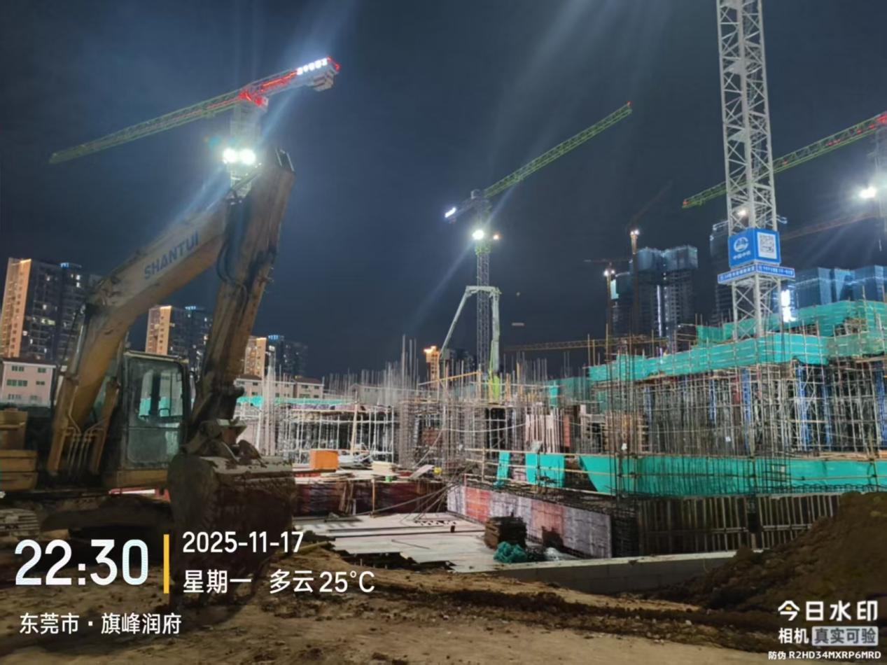接投诉后,分局于2025年11月17日14时18分致电投诉您,了解投诉内容,未能接通。分局于2025年11月17日22时30分派员前往现场调查。经查,位于东城街道火炼树社区金树路23号旗峰润府工地,现场在浇筑混凝土,产生一定的施工噪音,未能提供夜间施工有关手续,违反了《中华人民共和国噪声污染防治法》第四十三条第一款规定。执法人员责成其停止施工,依程序向当事人发出《乱排放建筑施工噪声类告知书》,要求施工方按照《中华人民共和国噪声污染防治法》有关规定制定噪声污染防治实施方案,采取有效措施,减少振动、降低噪声。不得在夜间进行产生噪声的建筑施工作业。如因特殊需要必须连续施工作业的,应按规定取得相关证明,并按要求公示或公告。