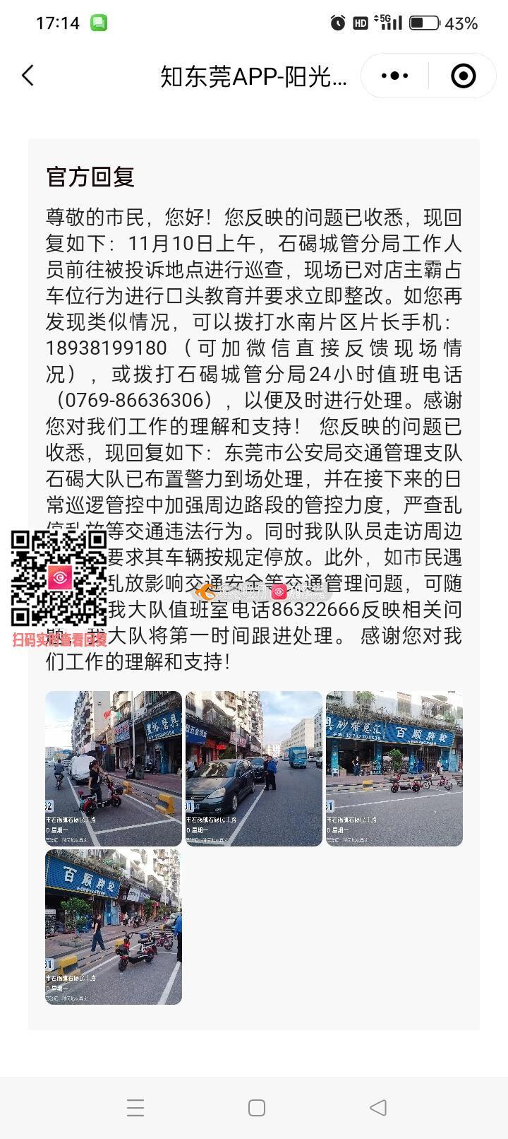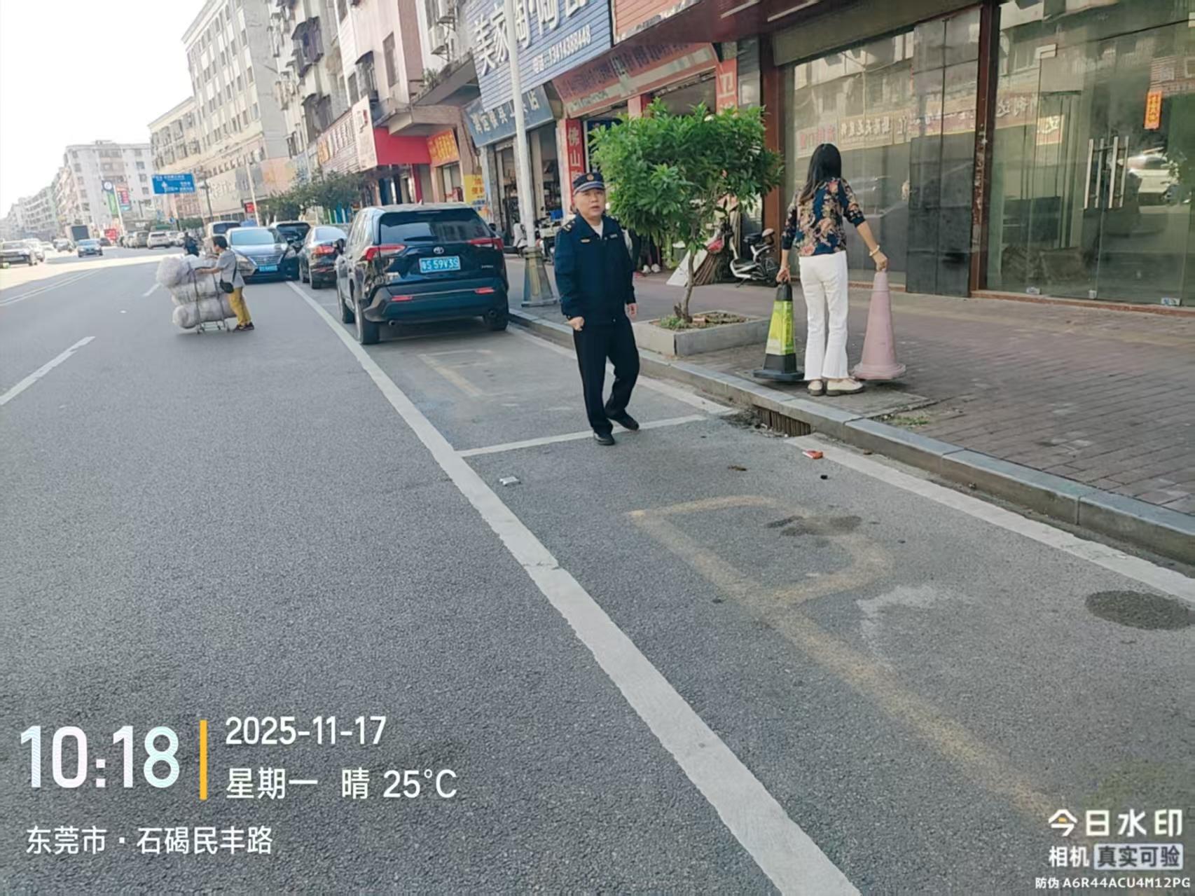 尊敬的市民,您好!您反映的问题已收悉,现回复如下:11月17日上午,石碣城管分局工作人员前往被投诉地点进行处理,现场将霸占停车位的物品逐一清理,并警告店铺负责人不得私自霸占公共停车位。如您再发现类似情况,可以拨打水南片区片长手机:18938199180(可加微信直接反馈现场情况),或拨打石碣城管分局24小时值班电话(0769-86636306),以便及时进行处理。 您反映的问题已收悉,现回复如下:东莞市公安局交通管理支队石碣大队已布置警力到场处理,并在接下来的日常巡逻管控中加强周边路段的管控力度,严查乱停乱放等交通违法行为。也欢迎您及时举报交通违法车辆,警民共创优良交通秩序。此外,如市民遇上乱停乱放影响交通安全等交通管理问题,可随时拨打我大队值班室电话86322666反映相关问题,我大队将第一时间跟进处理。 感谢您对我们工作的理解和支持!