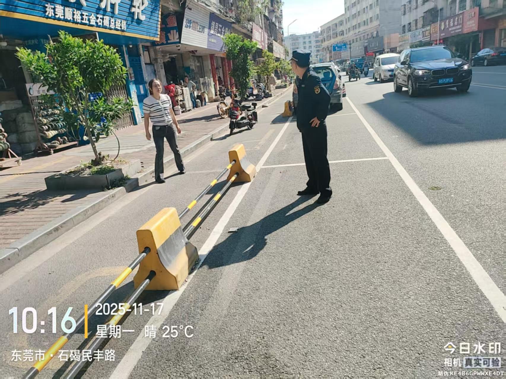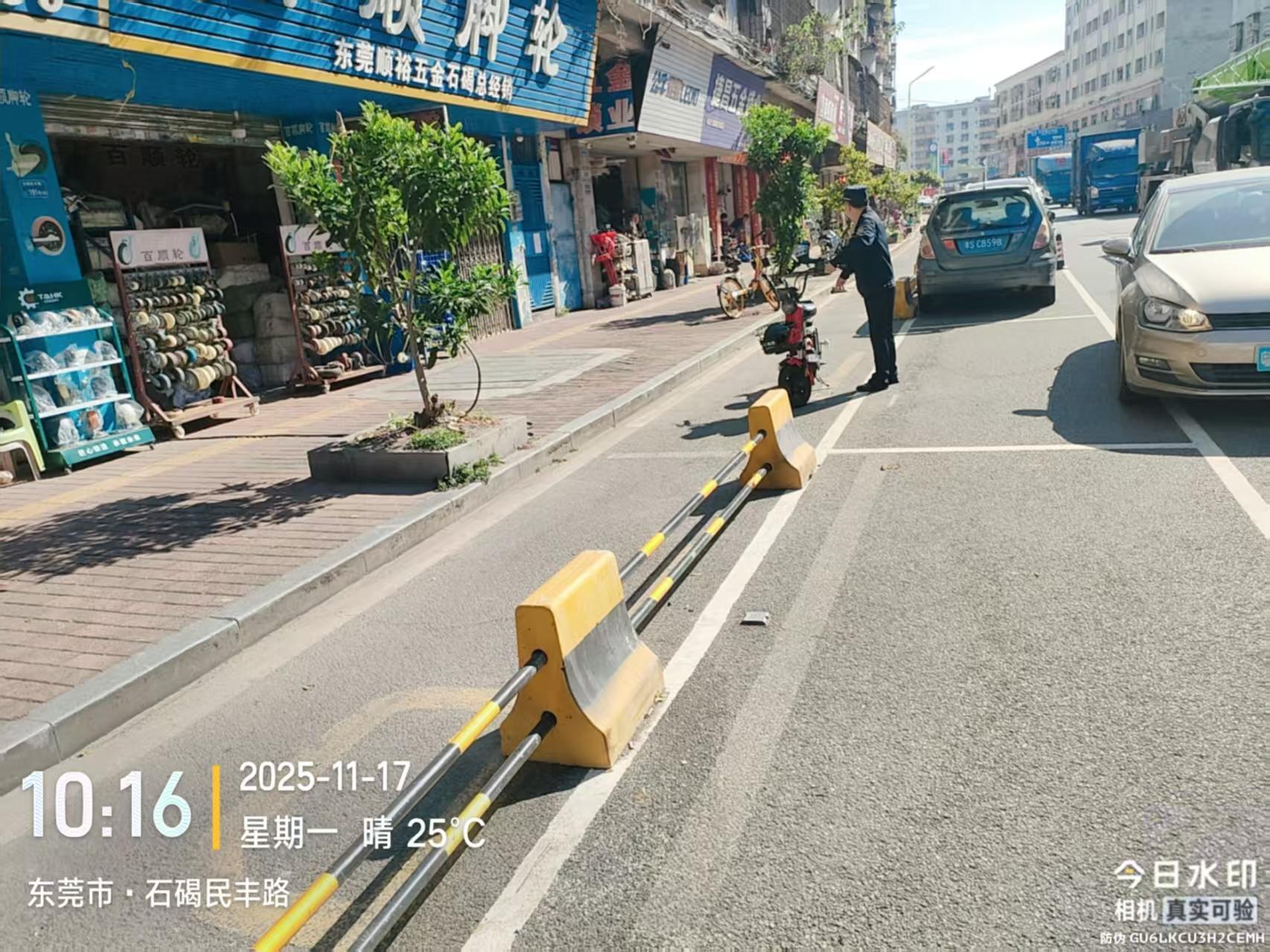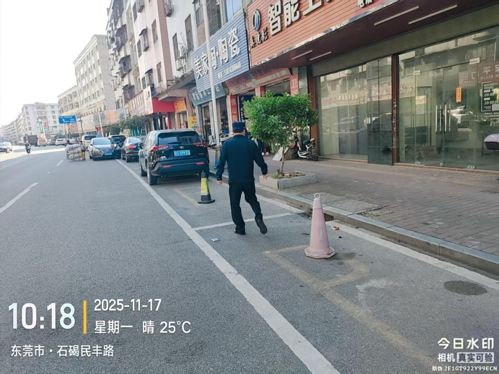 尊敬的市民,您好!您反映的问题已收悉,现回复如下:11月17日上午,石碣城管分局工作人员前往被投诉地点进行处理,现场将霸占停车位的物品逐一清理,并警告店铺负责人不得私自霸占公共停车位。如您再发现类似情况,可以拨打水南片区片长手机:18938199180(可加微信直接反馈现场情况),或拨打石碣城管分局24小时值班电话(0769-86636306),以便及时进行处理。 您反映的问题已收悉,现回复如下:东莞市公安局交通管理支队石碣大队已布置警力到场处理,并在接下来的日常巡逻管控中加强周边路段的管控力度,严查电动自行车、自行车等物品霸占停车位交通违法行为。也欢迎您及时举报交通违法车辆,警民共创优良交通秩序。此外,如市民遇上影响交通安全等交通管理问题,可随时拨打我大队值班室电话86322666反映相关问题,我大队将第一时间跟进处理。 感谢您对我们工作的理解和支持!
