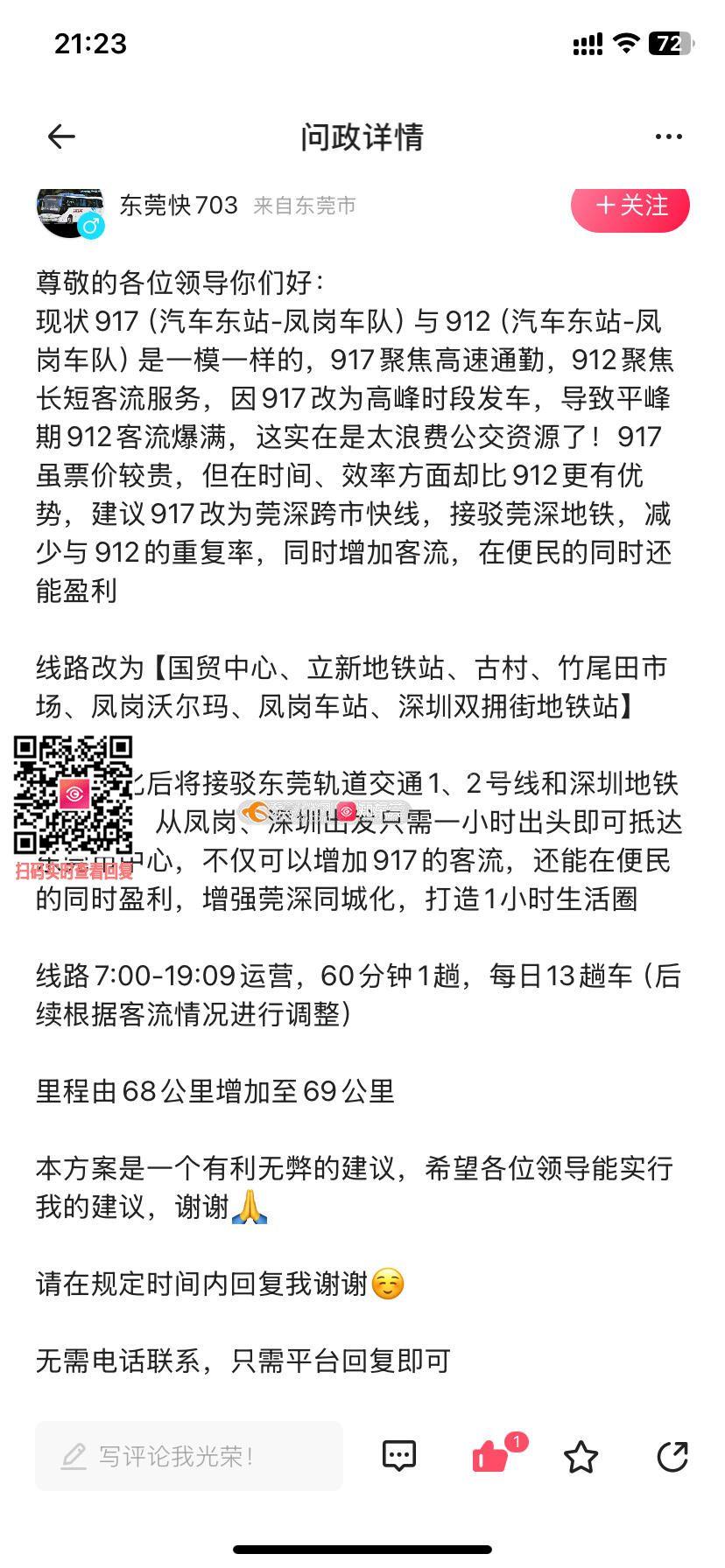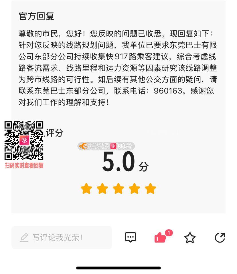 一周已过,请问关于快917路调整为跨市线路的意见如何?因为据我了解深圳地铁10号线是从深莞交界一直到深港交界的,且经过深圳市区,客流还是很大的,东莞地铁一号线也于下周五开通,如果快917调整就可以连接两条地铁线,促进莞深同城化,里程只增加了一公里,车辆续航能力是足够的,且线路可在凤岗车站、凤岗车队、国贸中心、东城车站等地进行充电和停放,取消汽车东站和凤岗车队段可由快912代替,对两地通勤影响不大,相反快917连接东莞市区和深圳地铁更便于交通,从凤岗到市区仅需一小时,大大节省了时间,希望各位领导能结合乘客意见和深莞地铁互通等方面进行调整,便利其交通 无需电话联系,只需平台回复即可