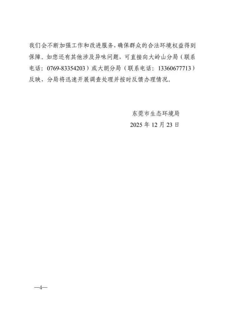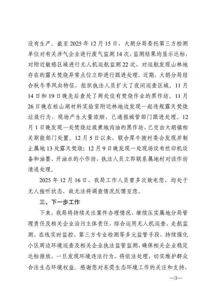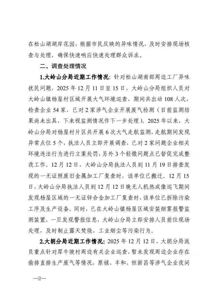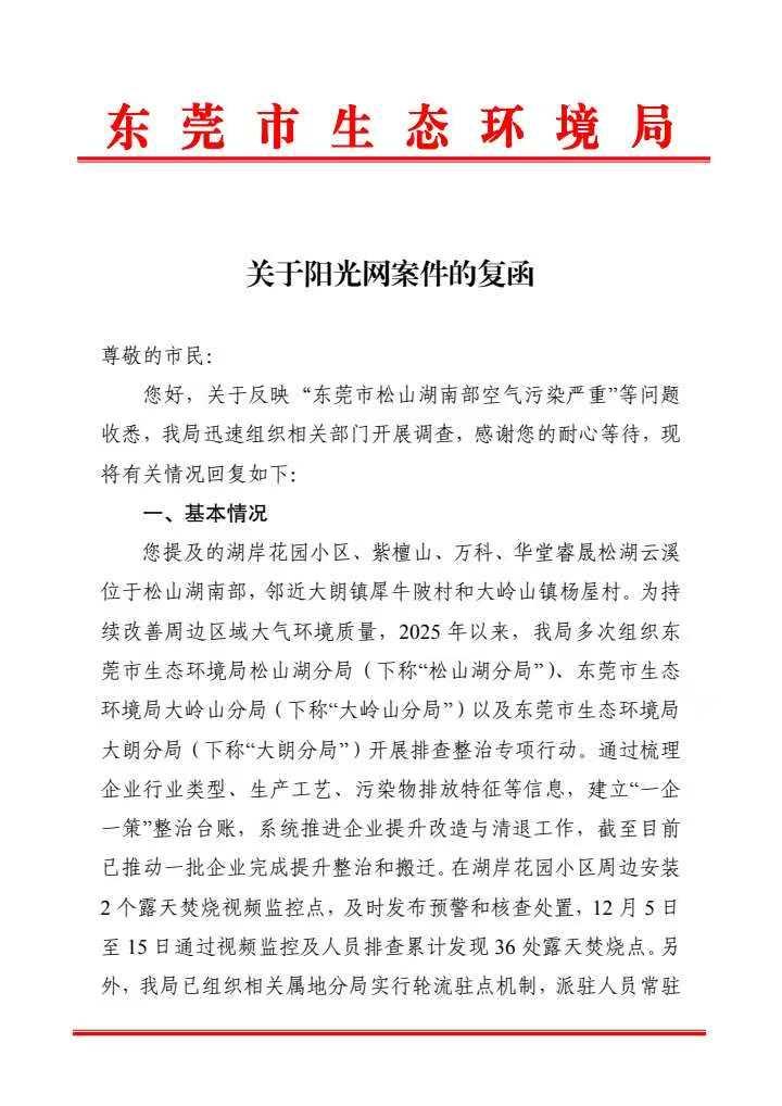 尊敬的市民: 您好,关于反映“东莞市松山湖南部空气污染严重”等问题收悉,我局迅速组织相关部门开展调查,感谢您的耐心等待,现将有关情况回复如下: 一、基本情况 您提及的湖岸花园小区、紫檀山、万科、华堂睿晟松湖云溪位于松山湖南部,邻近大朗镇犀牛陂村和大岭山镇杨屋村。为持续改善周边区域大气环境质量,2025年以来,我局多次组织东莞市生态环境局松山湖分局(下称“松山湖分局”)、东莞市生态环境局大岭山分局(下称“大岭山分局”)以及东莞市生态环境局大朗分局(下称“大朗分局”)开展排查整治专项行动。通过梳理企业行业类型、生产工艺、污染物排放特征等信息,建立“一企一策”整治台账,系统推进企业提升改造与清退工作,截至目前已推动一批企业完成提升整治和搬迁。在湖岸花园小区周边安装2个露天焚烧视频监控点,及时发布预警和核查处置,12月5日至15日通过视频监控及人员排查累计发现36处露天焚烧点。另外,我局已组织相关属地分局实行轮流驻点机制,派驻人员常驻在松山湖湖岸花园,根据市民反映的异味情况,及时安排现场核查与处理,确保快速响应快速处理群众诉求。 二、调查处理情况 1.大岭山分局近期工作情况:针对松山湖南部周边工厂异味扰民问题,2025年12月11日至15日,大岭山分局组织人员对大岭山镇杨屋村区域开展大气环境巡查,期间共出动108人次,检查企业54家,已对2家涉气企业开展废气检测(目前监测结果尚未出具,下来视监测情况作下一步处理)。2025年以来,大岭山分局对杨屋村片区共开展6次大气走航监测,走航期间发现异常点位5个,执法人员立即开展调查,已对2家问题企业相关环境违法行为进行立案处罚,另外3个轻微问题点已督促完成整改工作。因回复内容有1000字限制,故完整答复请您查看附件。承办单位:东莞市生态环境局
