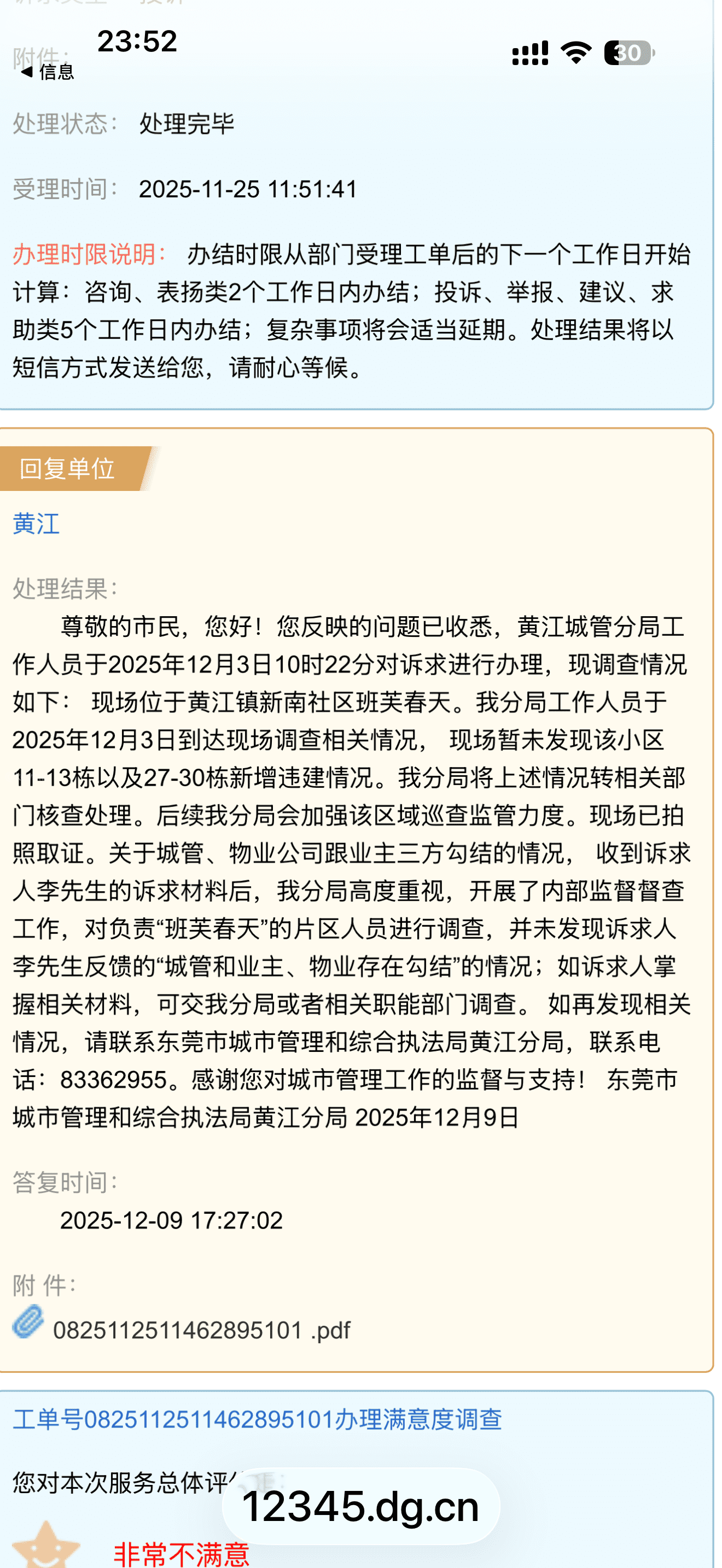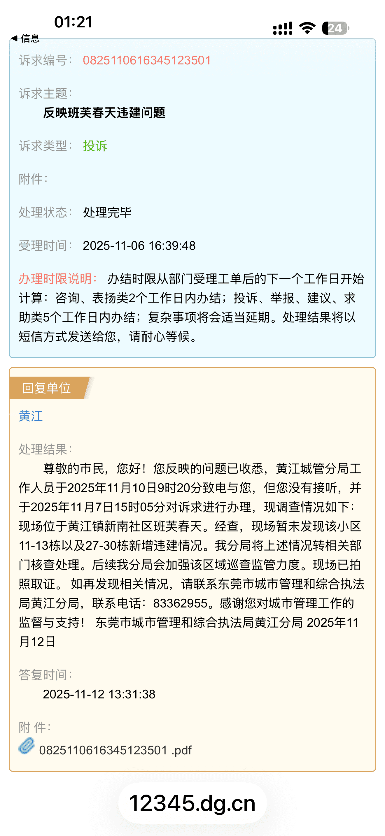 东莞市黄江镇班芙春天小区别墅大量违建,大部份已装修 别墅楼顶存在着加建一层,甚至两层的违建,数量多达上百套别墅,黄江镇城管大队视而不见,经12345投拆后回复,反溃,没有发现新增违建,在投诉人的逼问下,终于承认过去违建也算违建,但黄江城管部门对该小区没有任何执法行为,事实上现在还有不少别墅正在违建,造成过去大量别墅违建就是城管执法不严,有法不依,据了解,有人在中间通过施工单位收取高额的所谓办事费用,请市城管执法局尽快介入调查,尽快对违建进行处理,对内部渎职甚至违法人员加以处罚!
