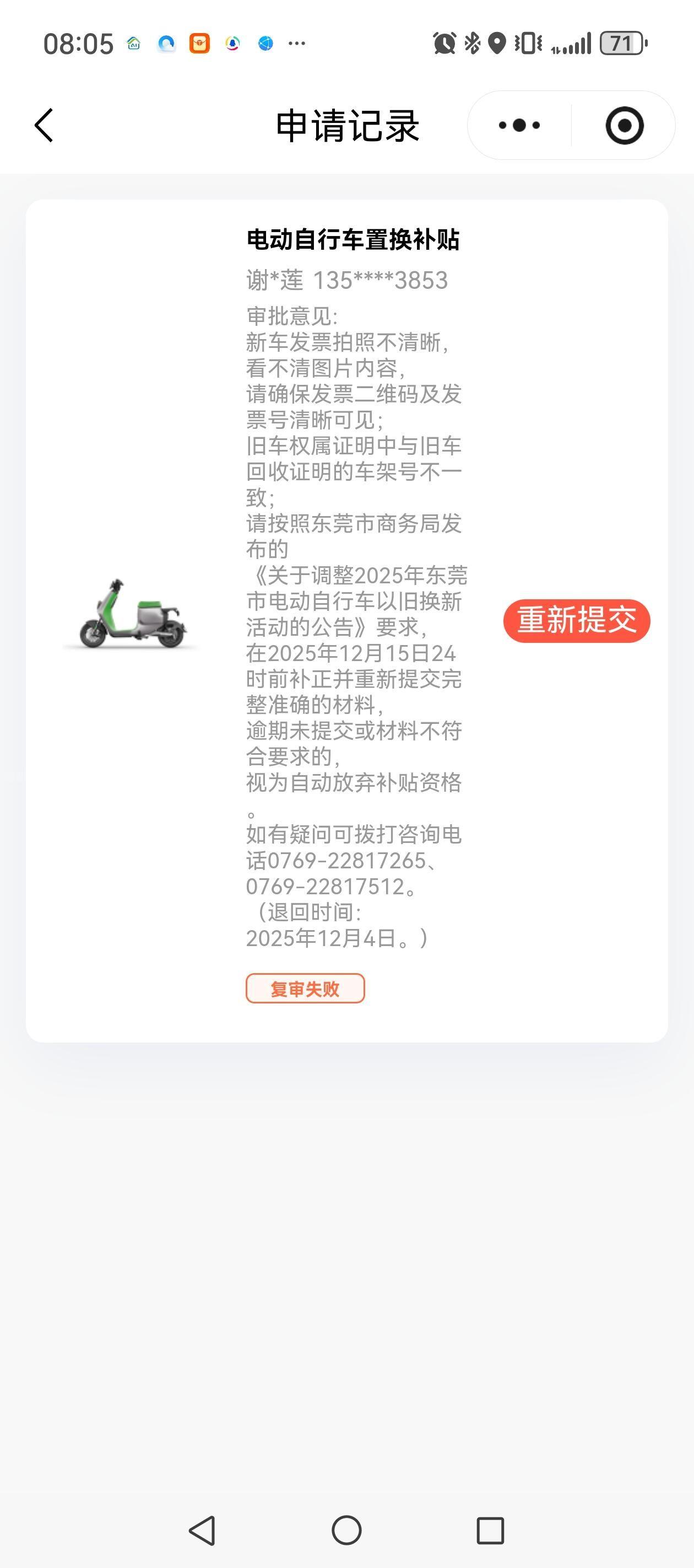 本人2025年7月20日购买新电动自行车,提交了三次资料,均被不同理由退回,且没有任何短信和电话通知,只能自己想起来时去粤焕新小程序查询,最后一次通知是2025年12月4日,截止时间是2025年12月15日,我于2025年12月17日去查询时已过最后时间。资料均是车行帮我提交的,为什么车行人员的不专业,东莞市商务局的不负责任(退一次说一个问题,且没有短信或电话通知),要我们平民老百姓来承担损失?我的诉求是,要么给我退回旧的电单车,要么补贴钱,请政府帮忙协助解决。