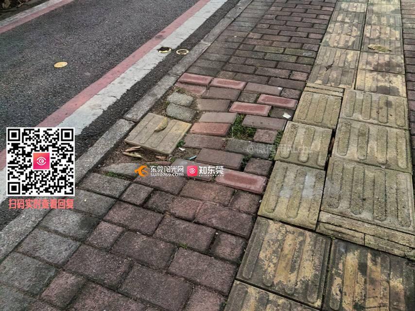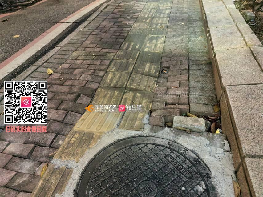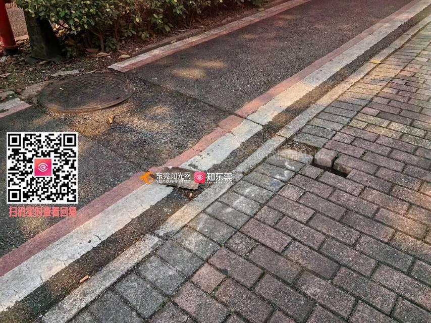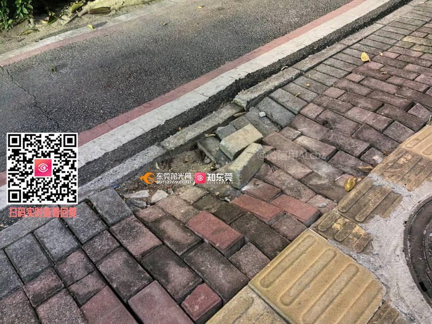 厚街湖景中学大门左侧人行道损坏,数年无人管,学生晚上放学有安全隐患,走路骑车容易摔跤