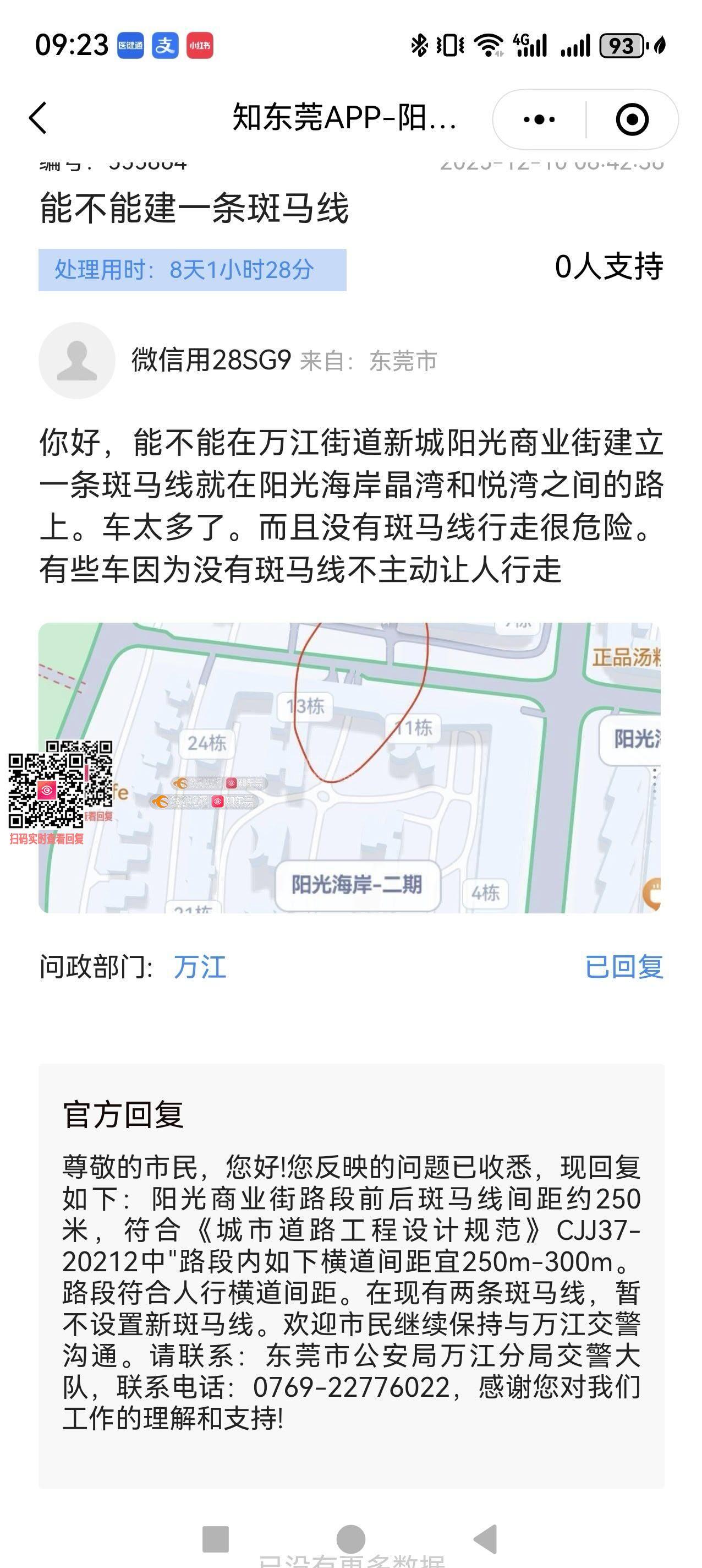 关于加斑马线,里面留了电话,我12月18号打电话那边问为什么不行,走的人最多就是小区之间那边,他说不是他回复的是同事,等晚点同事回来电话给我,结果等到19号还没回复,我又打电话给他,他后说今天一定回复你。结果等到20号了。给个回复有那么难吗?