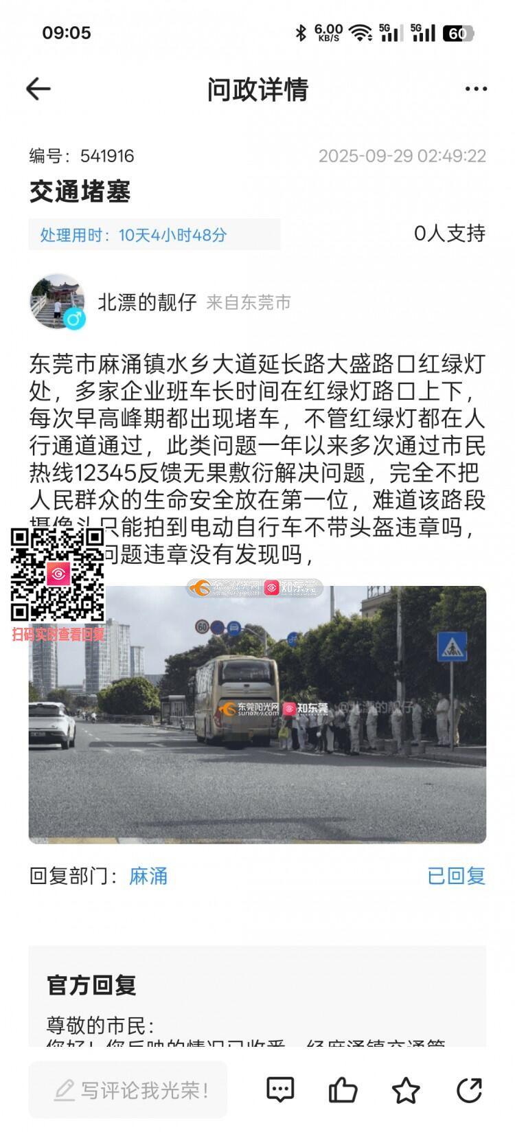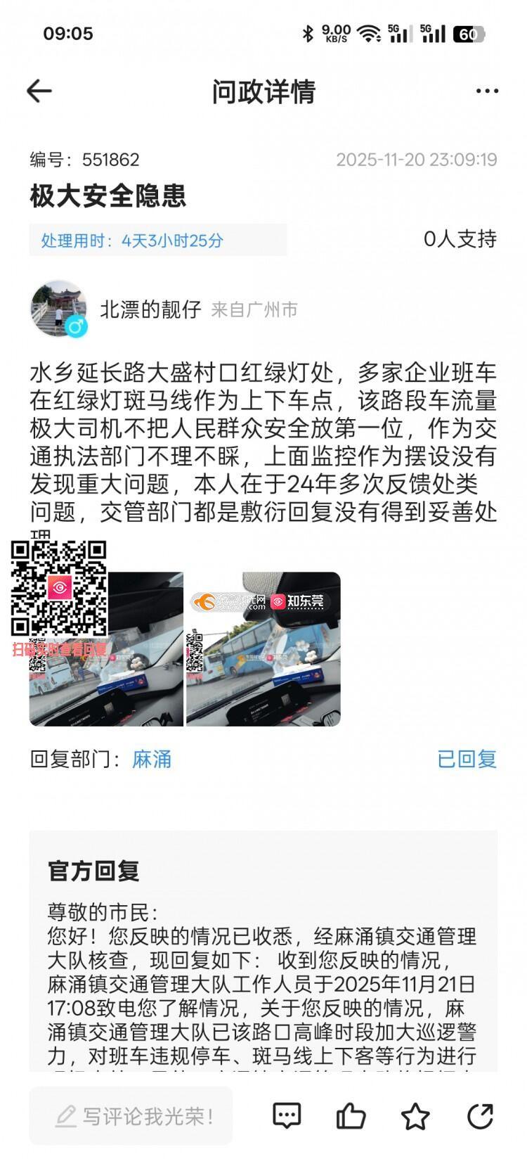 水乡延长路东莞市麻涌镇大盛村牌坊路段的红绿灯路口,长期有数家企业的通勤班车将机动车道、斑马线直行车道作为上下客站点。此行为已持续数年,虽经多次反映,但问题始终未得到根治,形成顽固的安全顽疾,对公共安全构成严重威胁。现恳请贵单位高度重视,采取切实有效的执法与工程措施,彻底消除该处安全隐患。
