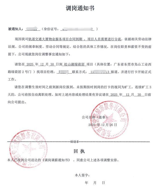 东莞轨道交通大厦赛格物业管理非法调配老员工