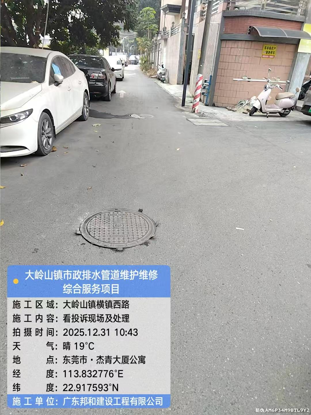 大岭山横镇西路杰青大厦公寓楼下左侧道路上两个下水井盖松动,电动车经过时井盖受力边缘敲起,发出哐当哐当异响,声音很大,请相关人员看到信息后实地确认整改。谢谢! 1、有安全隐患,时间长了松动会愈发严重; 2、哐当哐当异响声音很大,晚上10点后及早上6点前异响声音严重影响杰青大厦公寓楼上人员睡眠。