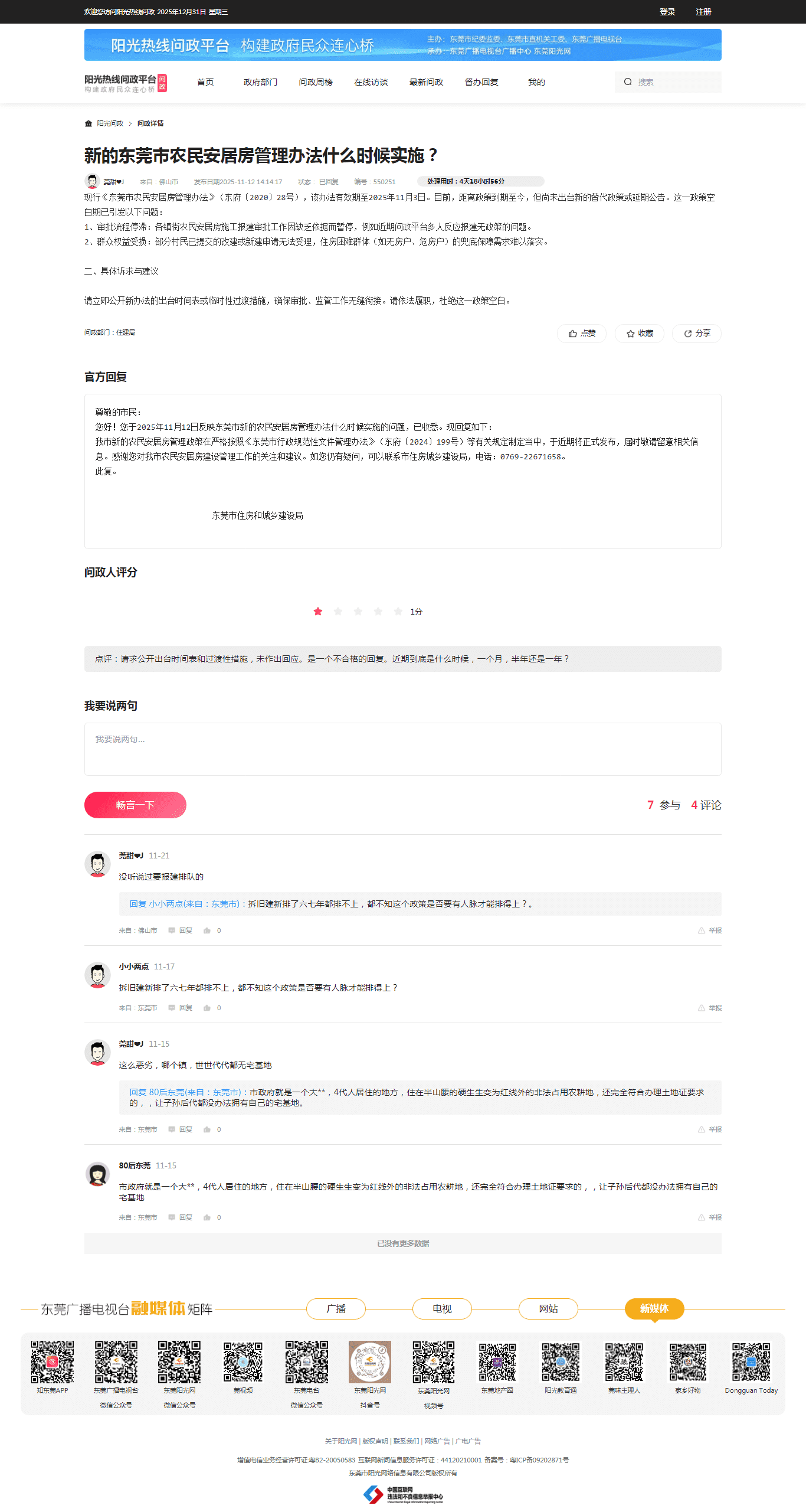 本人曾于前期在平台反映“新的东莞市农民安居房管理办法什么时候实施”的问题(编号:550251)。贵局于2025年11月12日回复称:“我市新的农民安居房管理政策在严格按照《东莞市行政规范性文件管理办法》(东府〔2024〕199号)等有关规定制定当中,于近期将正式发布。” 然而,自该回复至今,又过去了一段时间,所谓“近期”已然成为遥遥无期的代名词。 新的《东莞市农民安居房管理办法》依然未见任何正式发布或公开征求意见的迹象。原办法已于2025年11月3日到期,政策“空窗期”在不断延长,这已非“近期”二字可以轻描淡写。 因此,我不得不再次追问并提出诉求: 再次请问市住建局,您们所谓的“近期公布”已经两个月了,还要多久? 请向社会公开新办法制定的具体进展、剩余流程环节以及最晚正式发布的明确时间节点。