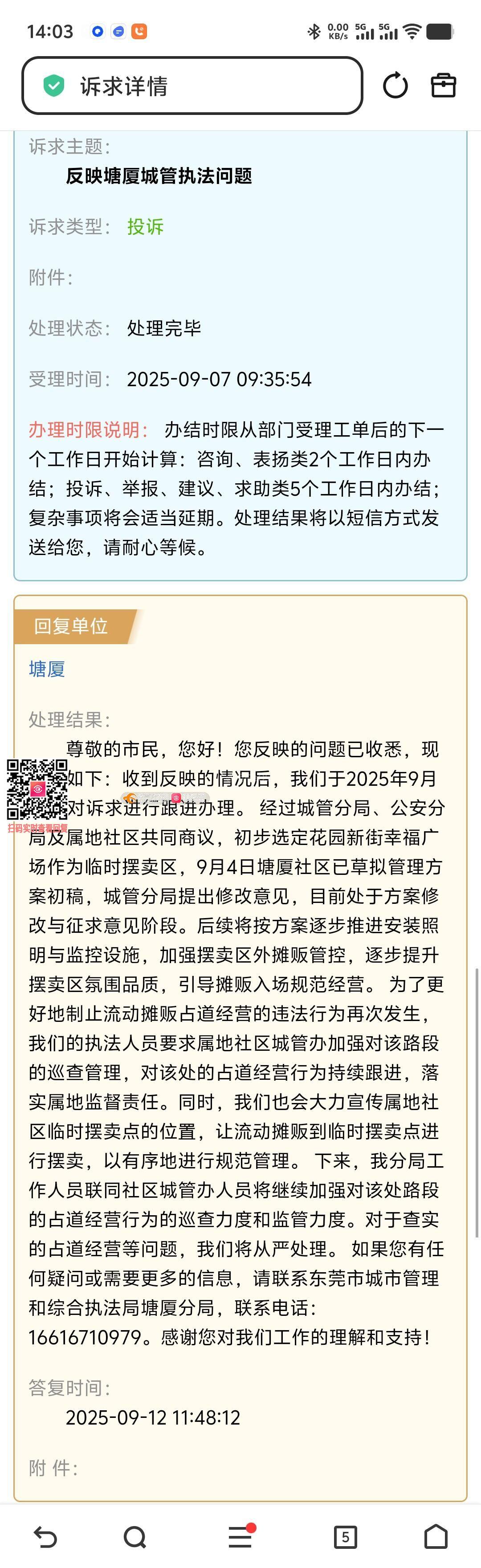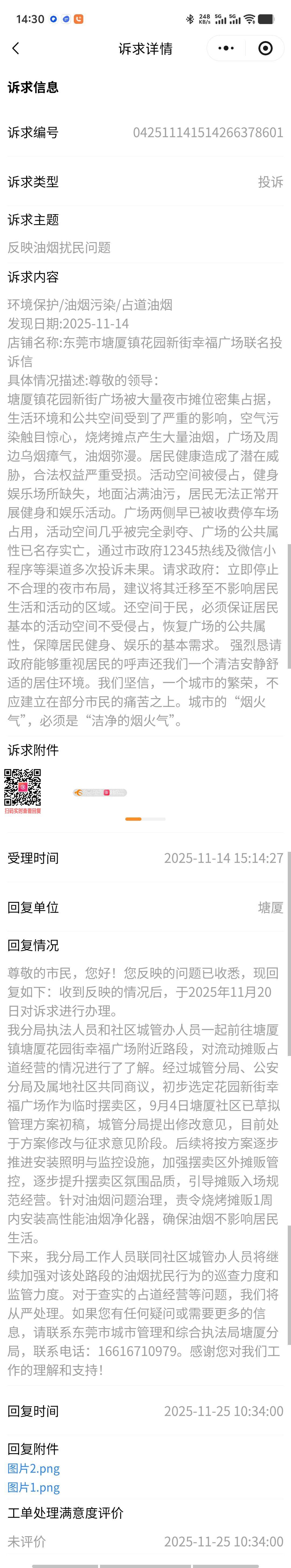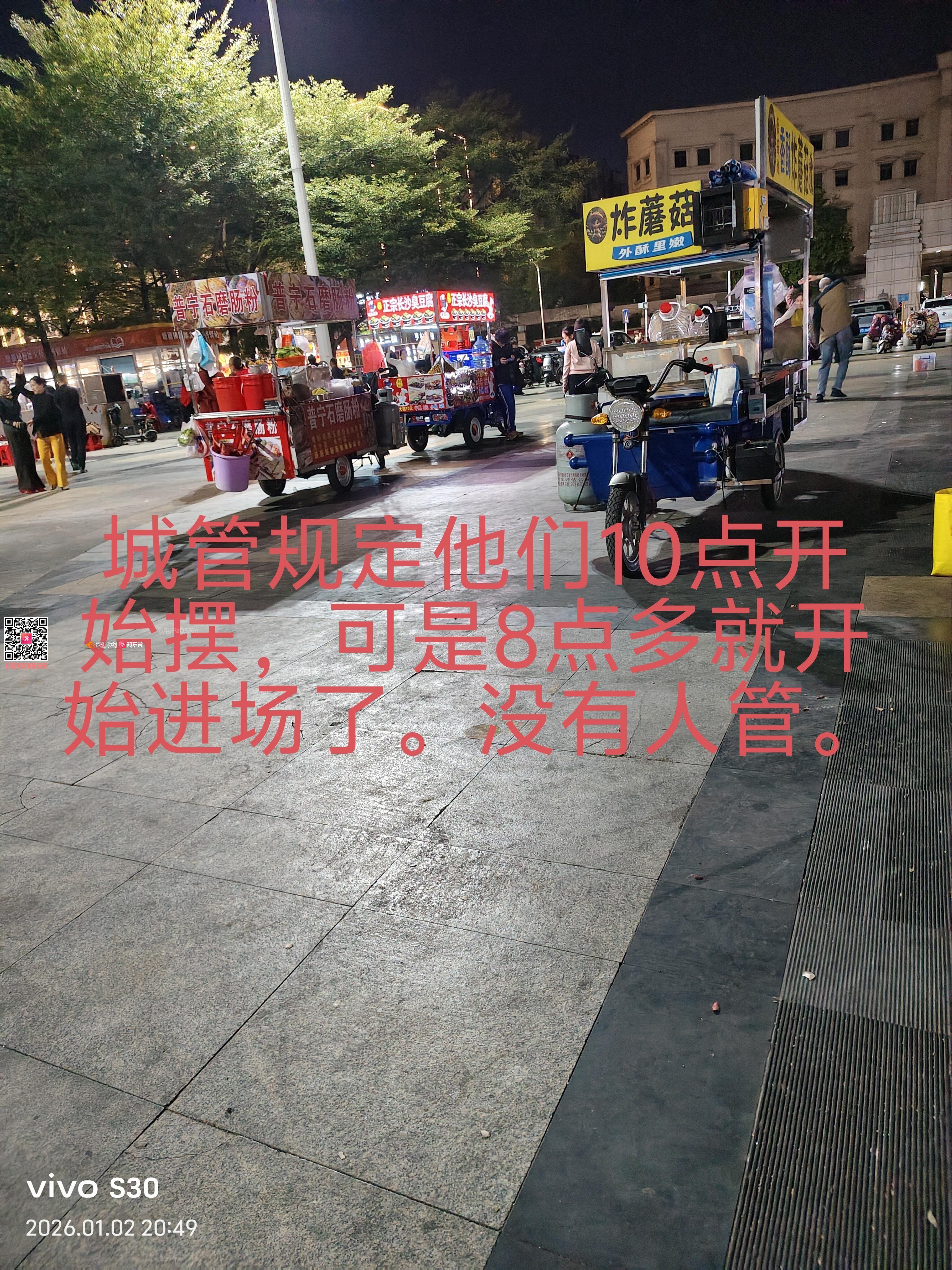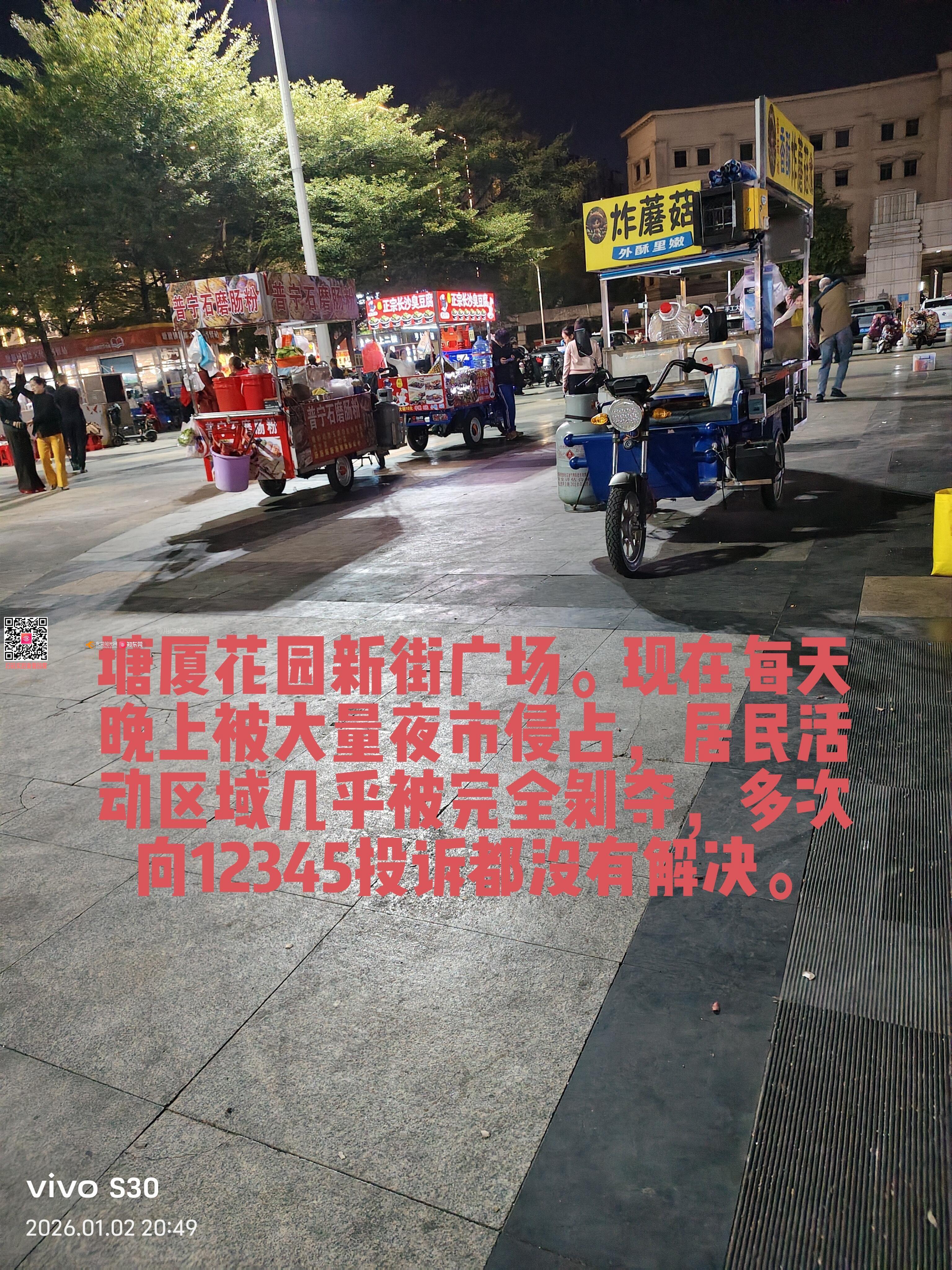 塘厦镇花园新街广场(位于东莞市第三人民法院正对面的广场)该广场夜市对周边居民的正常生活与健康造成了极大困扰,且经多次投诉仍未得到有效解决 违规提前占道经营:该夜市虽经批准,但明确规定应在晚上10点后开始。然而,实际情况是,每天傍晚约8点多,大量摊贩便提前涌入广场,占用全部公共空间,导致广场原有的居民休闲、健身功能完全丧失。 严重的油烟污染:油烟弥漫至周边居民楼内,这不仅污染空气,更对居民(尤其是有老人、儿童的家庭)的呼吸道健康构成直接威胁,违反了《中华人民共和国大气污染防治法》中关于防治油烟污染的规定。 经营期间噪音不断,收摊后留下满地油污和垃圾,破坏市容环境卫生。 多人已通过东莞市12345政府服务热线进行了多次投诉。城管部门都是机械式的回应,不仅没有解决治,摊贩更加肆无忌惮。当前局面反映了相关管理部门审批是否合理? 在居民密集区的核心公共广场设置产生大量油烟的夜市,其审批过程是否进行了充分的环境影响评估和民意征求? 监管是否到位? 摊贩长期、公然违反规定时间经营、以及显而易见的油烟直排污染行为,是否存在监管不作为、慢作为? 强烈恳请并督促相关部门: 立即进行现场核查与整顿:对该广场夜市进行联合执法,坚决取缔晚10点前的违规占道经营行为。 重新评估夜市设置:建议就该夜市设置的合理性、经营时间、区域范围及环保要求举行听证会或公开征求周边居民意见 根据《城市市容和环境卫生管理条例》及相关地方规定,城管部门批准临时占道、场地使用,必须以确保不干扰周边居民正常生活、不污染环境为前提。2. 关于“油烟污染”的明确禁止:《中华人民共和国大气污染防治法》第八十一条有明确规定, 总之,“城管批准”并不等于拥有了免罪金牌。当批准事项的实施后果触及了环境保护、公共卫生等法律红线,并严重侵害了公民合法权益时,该批准行为本身就可能违法,相关政府部门有责任予以纠正