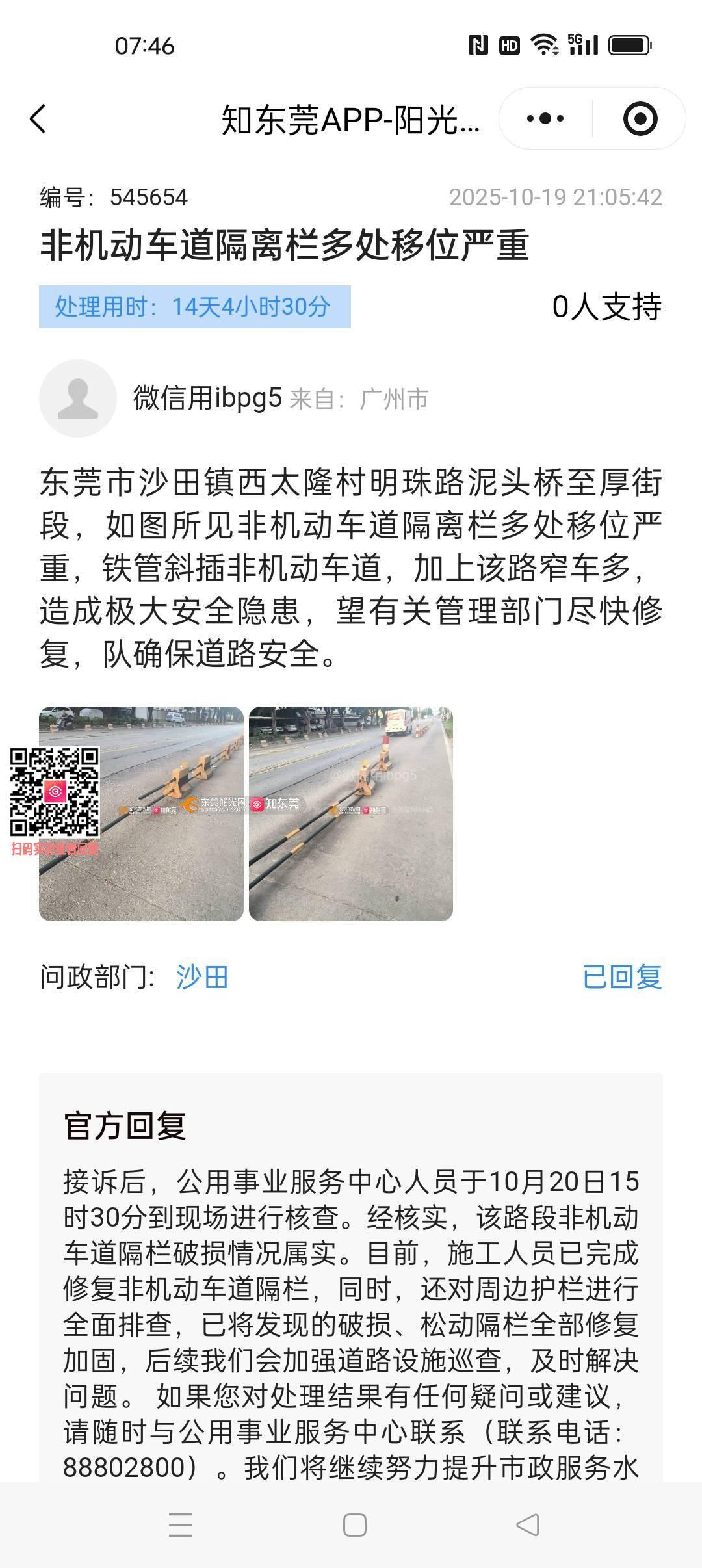 如附图可见距上一次如实反映隔离栏损坏时间不长,现在同一路段的隔离栏现状,比上一次损坏更加严重,因为该路段不但路窄货车多,而且完全没有路灯,为确保道路使用者安全,请求尽快修复,并加强日常巡查,谢谢!