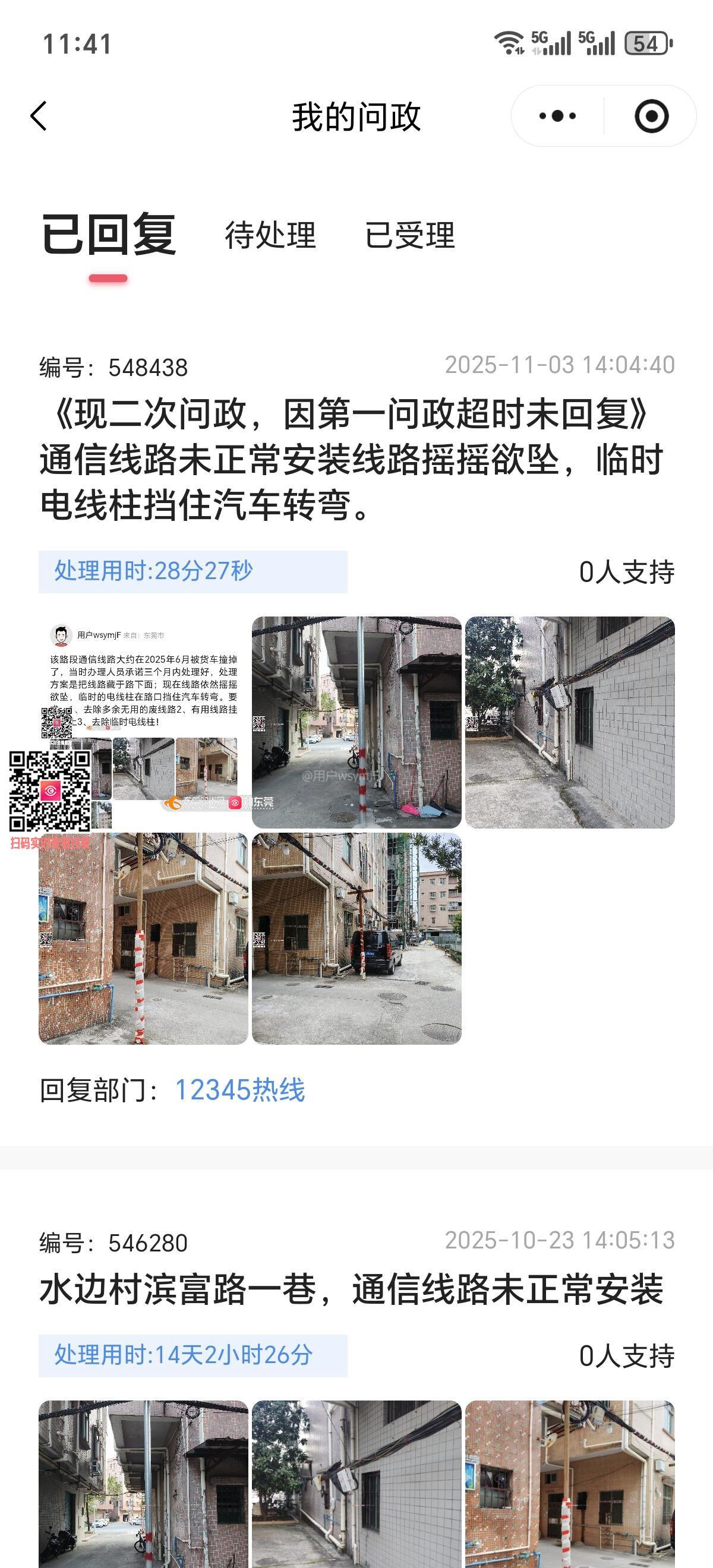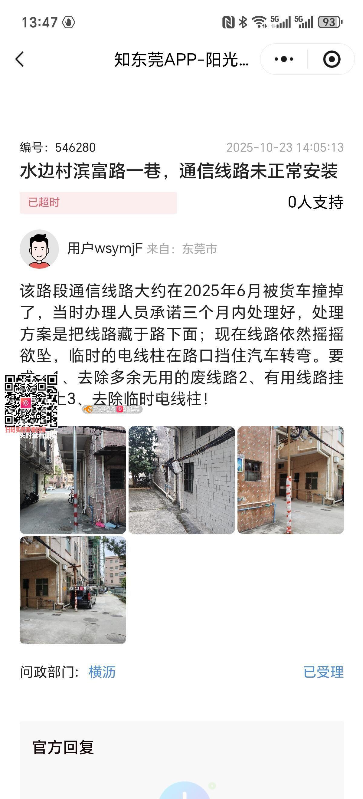 第1次问政2025年10月23日,问政编号民:546280;第2次问政2025年11月3日,问政编号民:548438;问政两次无果,现第3次问政! 该路段通信线路大约在2025年6月被货车撞掉了,当时办理人员承诺三个月内处理好,处理方案是把线路藏于路下面;但线路一直没有处理;现在线路依然摇摇欲坠,临时的电线柱在路口挡住汽车转弯。要求:1、去除多余无用的废线路2、有用线路挂上墙上3、去除临时电线柱!