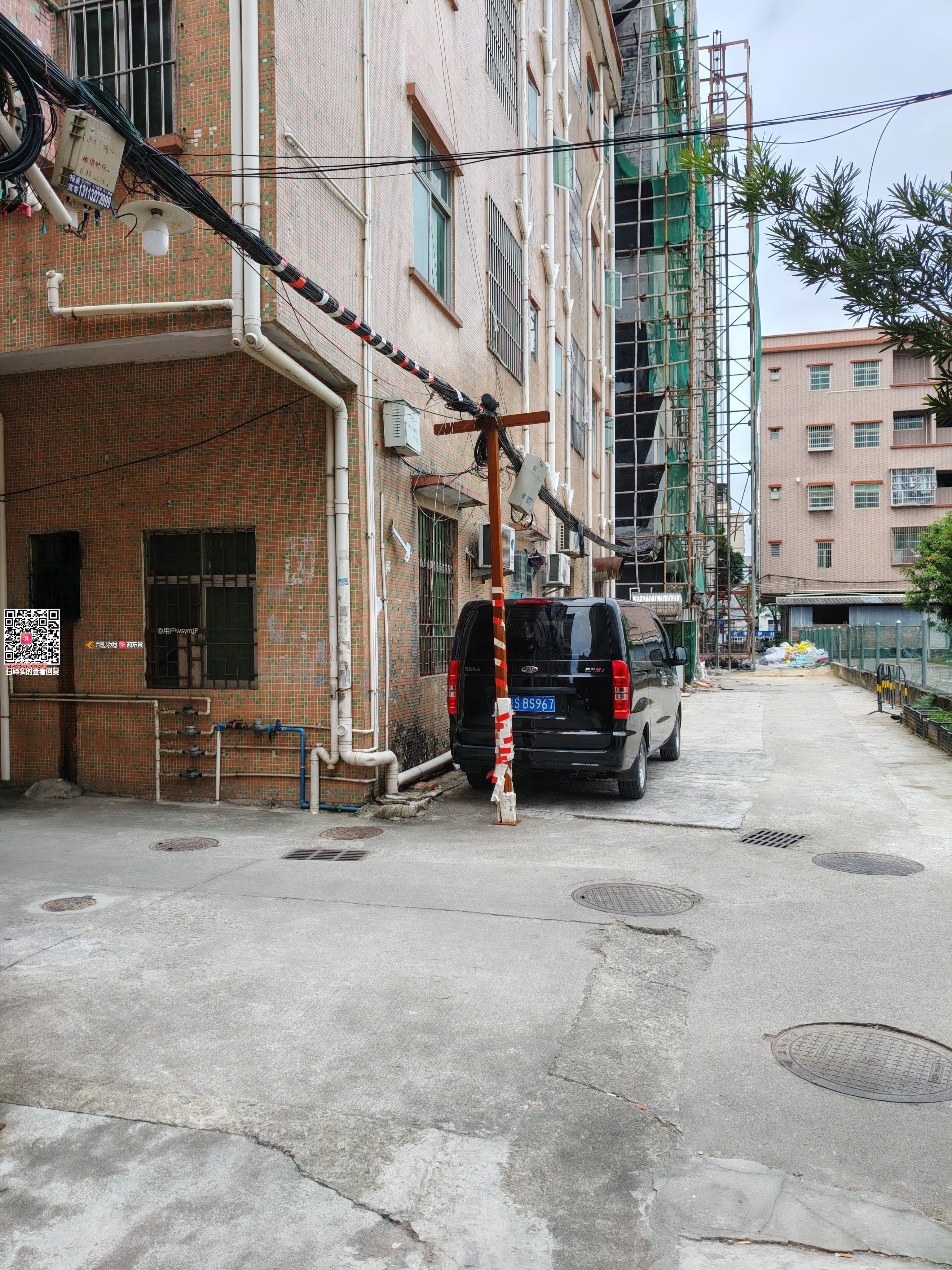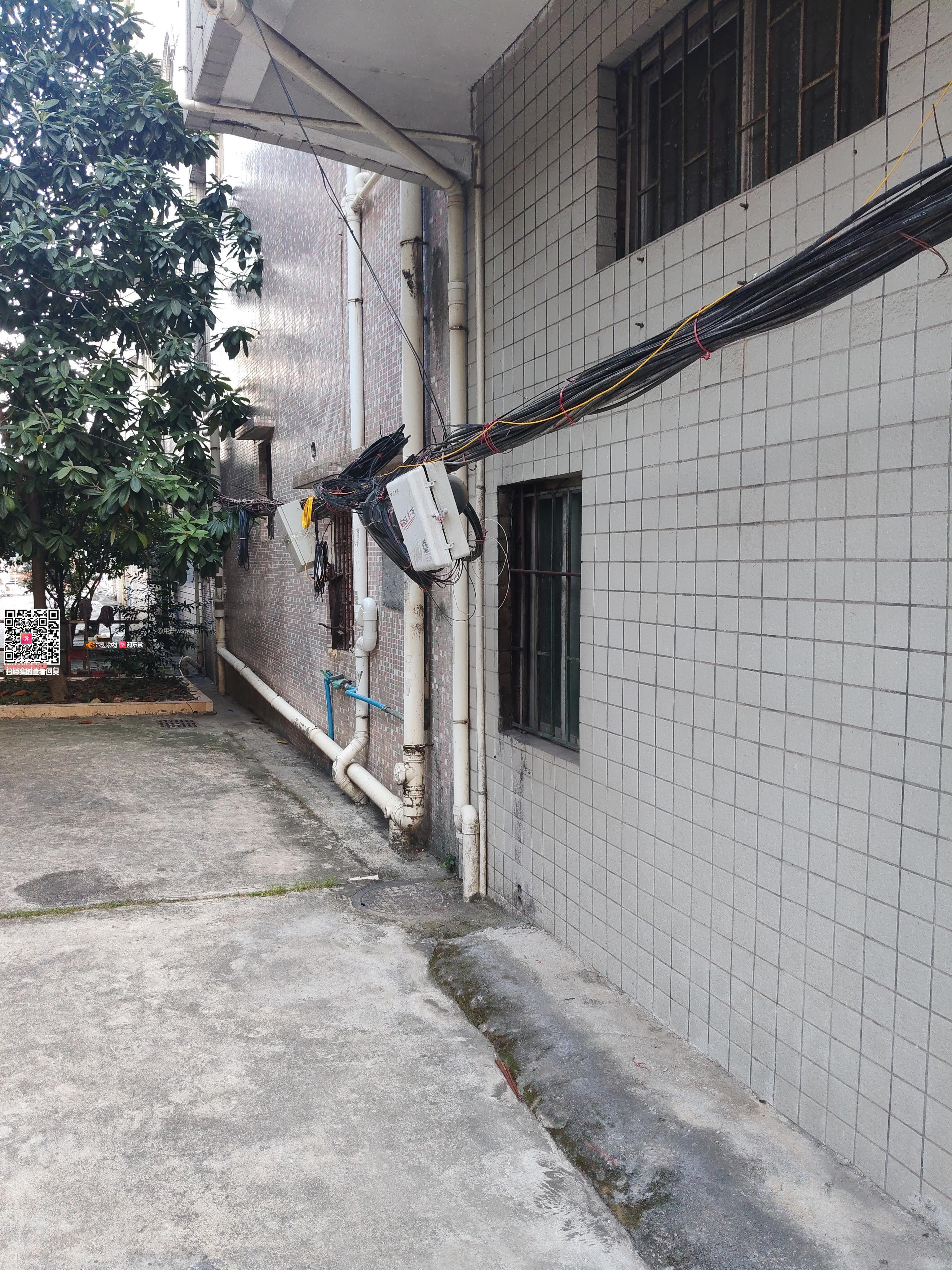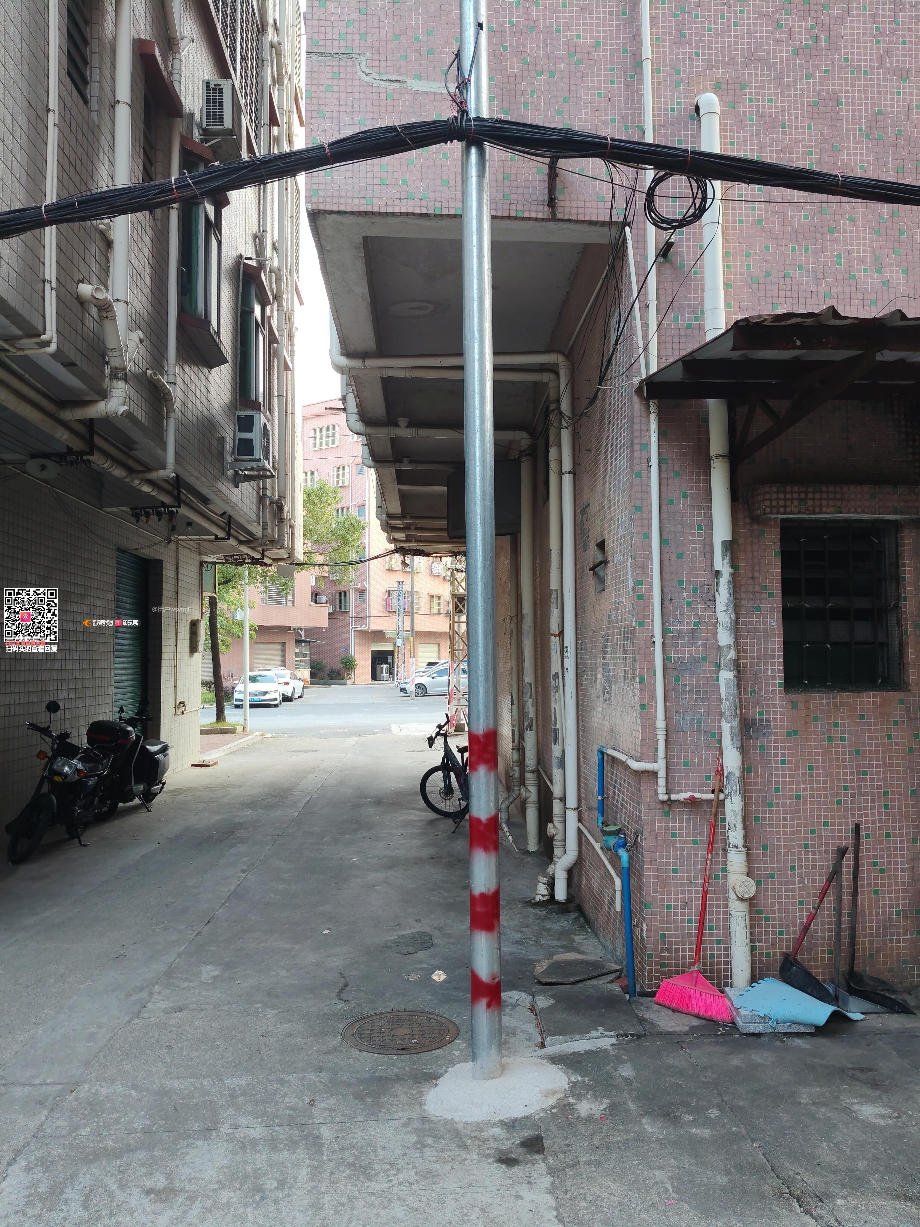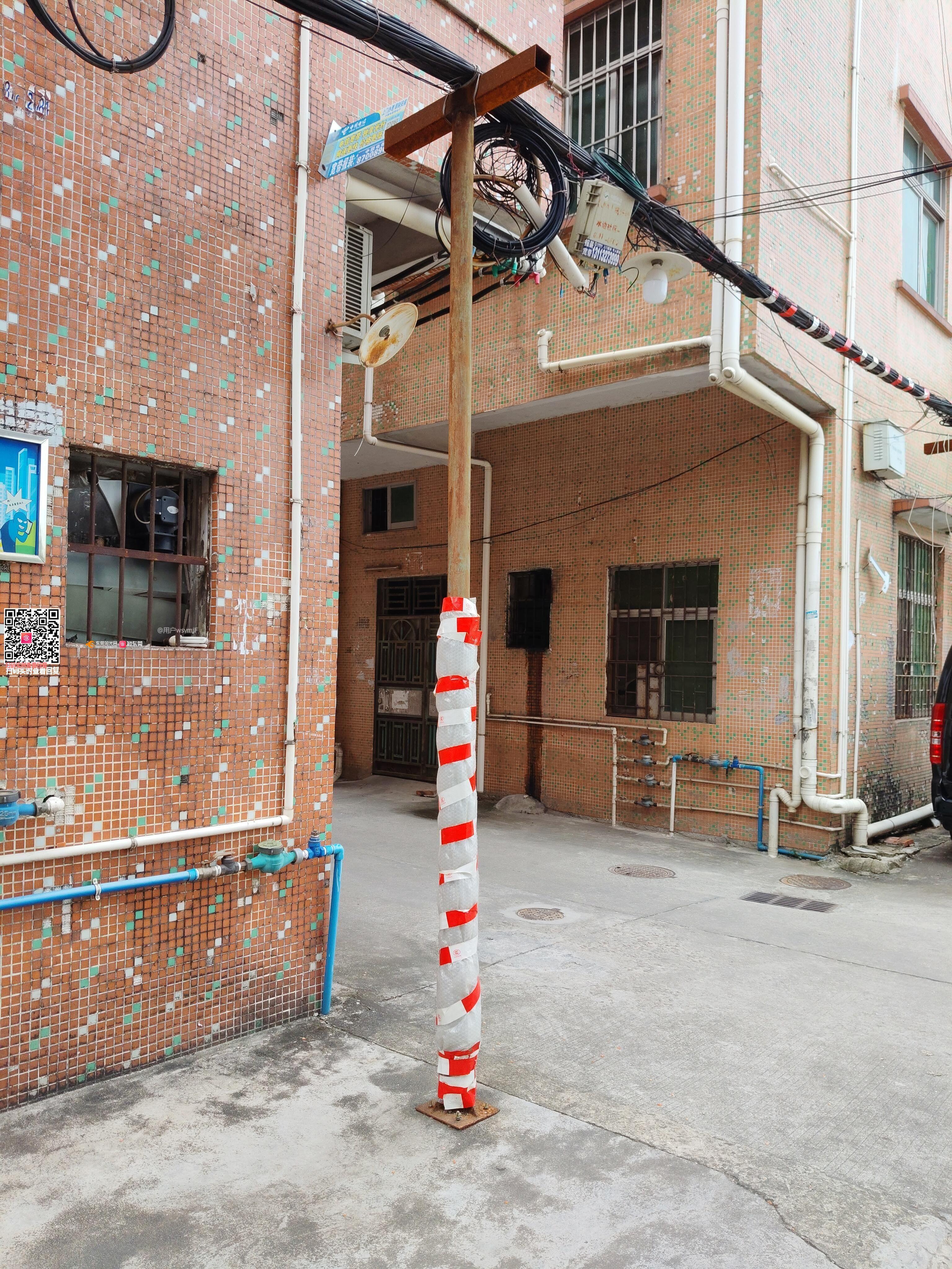 《问政两次无果,现第三次问政》通信线路未正常安装线路摇摇欲坠,临时电线柱挡住汽车转弯。