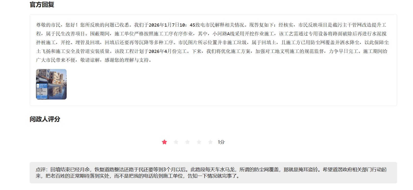 本人于2026年1月4日反映道滘镇小河路(宝泰大厦路段)施工周期明显过长,影响镇容环境和市民日常出行,然而道滘镇有关部门在处理此事非常敷衍,存在懒政不作为的嫌疑,理由如下: 1、该路段约50米,在2025年12月已经完成了开挖埋管并回填土,回复里说要恢复路面整洁,方便市民通行,还需要3个月,预计在2026年4月份。2025年12月前已经施工超过了3个月,50米长的路段,要施工长达半年之久,长期影响周边市民出行和体验,很不能理解; 2、1月4的反馈该路段施工问题,道滘政府有关部门未经本人同意,擅自把本人的电话信息给到施工单位,然后就不了了之; 3、回复里说施工方已用防尘网覆盖并洒水降尘,以此保障尘土飞扬和施工安全及管道安装质量。回复当天换了新的防尘网,结果没有撑过3天,防尘网就破烂不堪,车辆路过,尘土飞扬; 4、回复里说该路段施工属于民生工程。请道滘政府有关部门重视民生诉求,而不是打着改善民生的旗帜,实际干着影响民生的事。 备注:道路图片为2026年1月15日新拍。