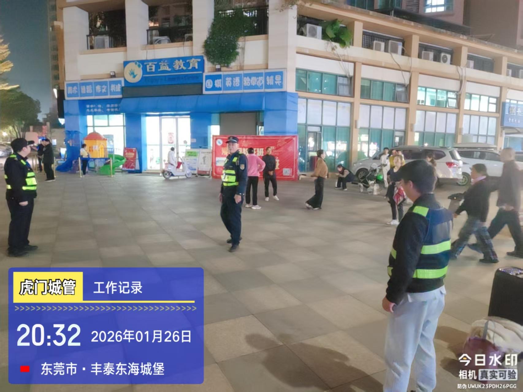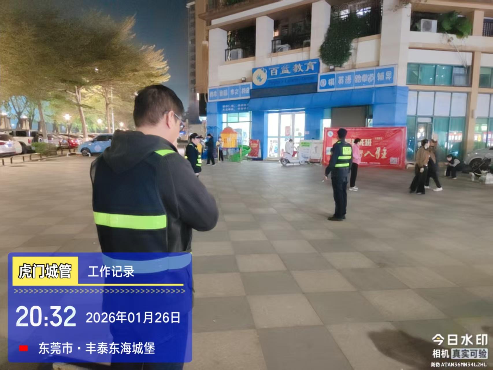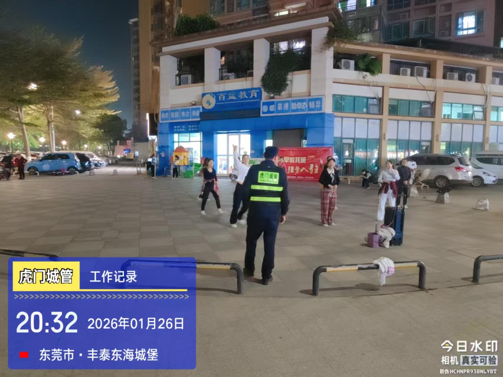 尊敬的市民,您好!您反映的问题已收悉,现回复如下:接投诉后,我分局工作人员2026年1月26日派出执法人员联同社区工作人员到现场进行调查,发现该处晚上确有广场舞活动,执法人员现场对当事人进行劝导教育,要求其调低音量,避免对周边居民造成影响。我分局已安排属地社区做好相关监督管理工作。如有城市管理方面的问题,可致电东莞市城市管理和综合执法局虎门分局24小时值班电话:89328222或通过微信公众号“东莞城市管理”进行反映。 感谢您对城市管理工作的监督与支持!