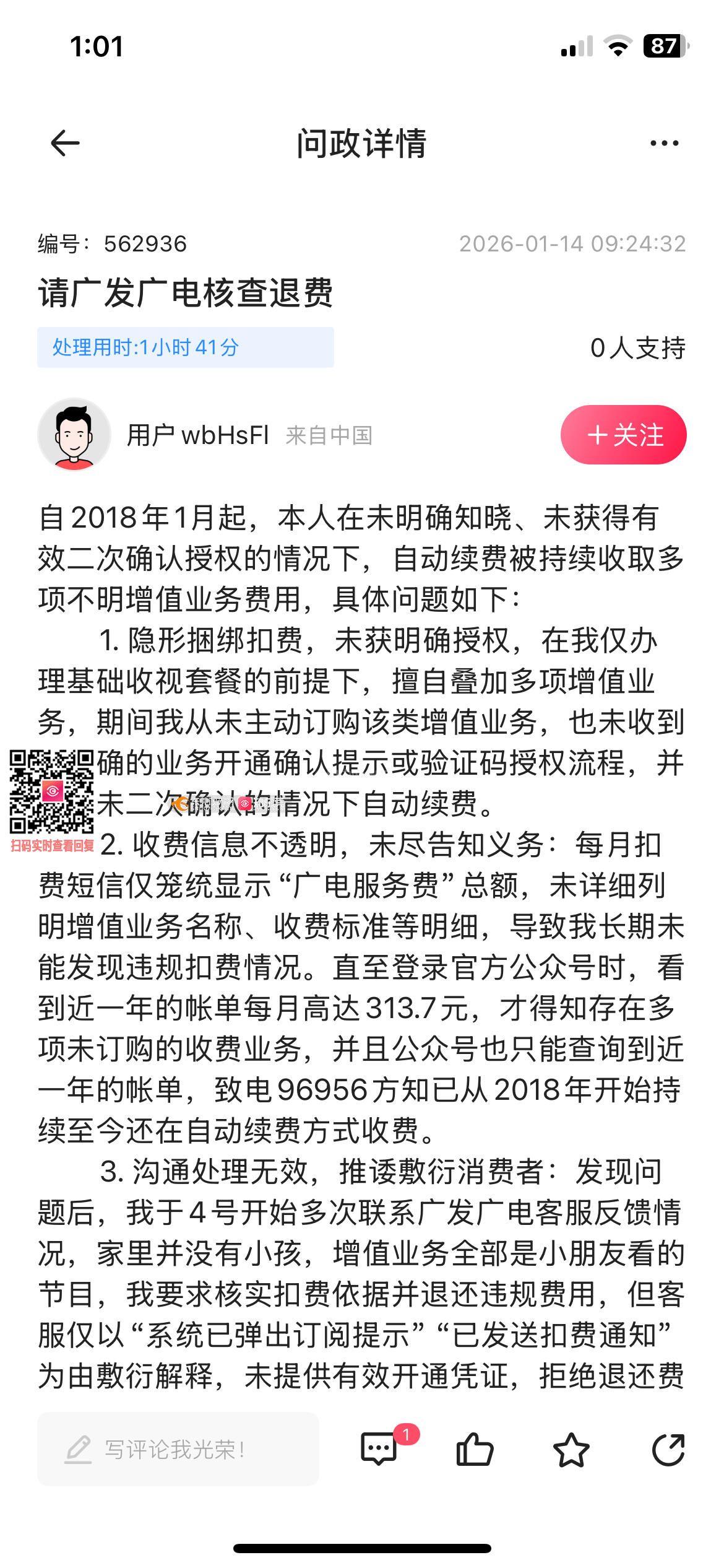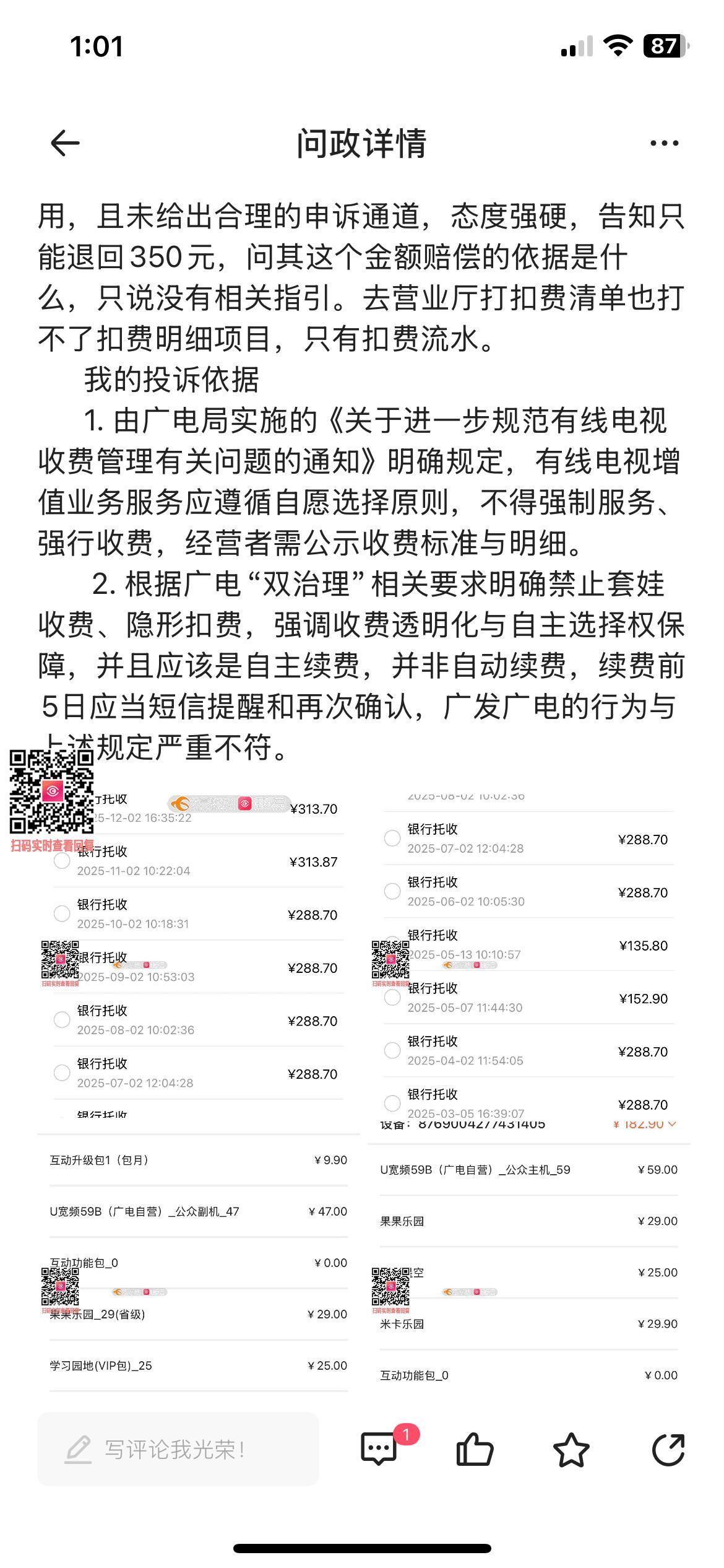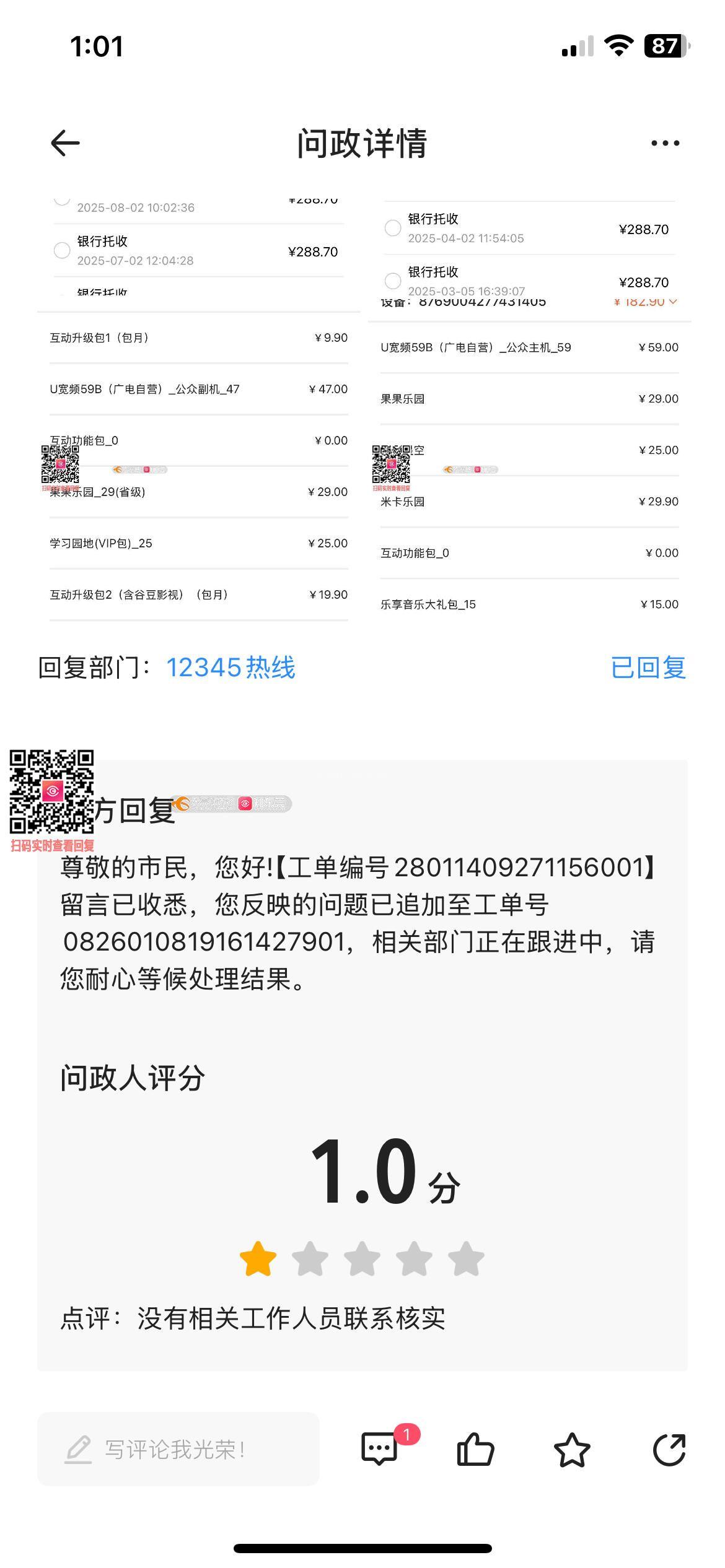 问政编号562936是12345给我的回复,拔打12345投诉是广电的回复,请问贵部门有核查核实吗?关于广电给我的回复,请给我说明问题:1电视弹屏可作为自动续费的依据吗?是开通依据还是自动续费?如果是自动续费,请问是根据广电总局的双确认要求吗?有二次确认吗?有提前告知是否需要续费吗?2使用记录请发给我,是几年几月几号看了什么节目,时长多久?3发送订购和扣费信息有完全告知是什么费用吗?只发送一个扣费总额,并无相关扣费项目,而且是一个月两次,并未发现,到近一年变成一月一扣,才发现很不正常才去查帐单。针对以上问题,请回复!
