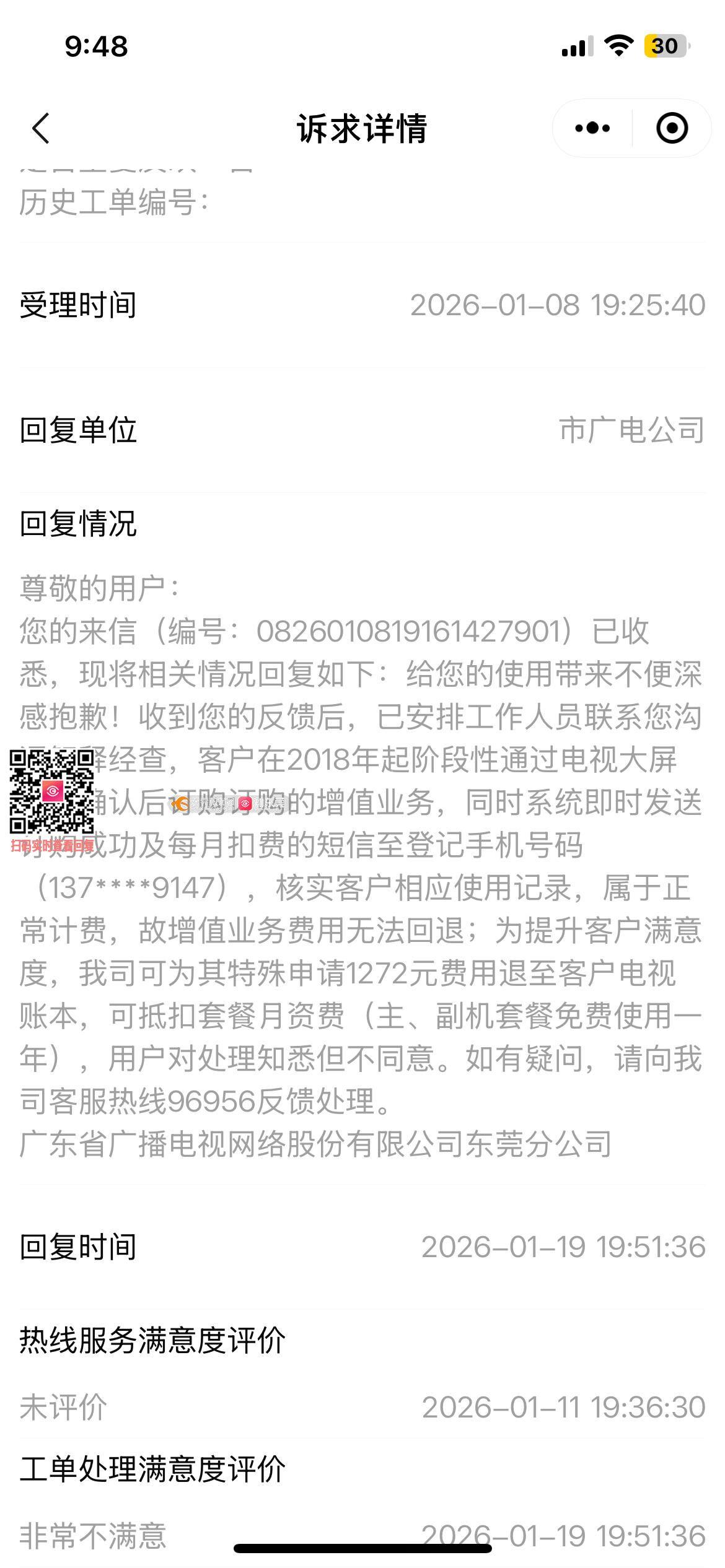 尊敬的用户: 您的来信已收悉,现将相关情况回复如下:给您的使用带来不便深感抱歉!经核查在2018年起阶段性通过电视大屏二次确认后订购订购的增值业务,同时我司系统即时发送订购成功及每月扣费的短信至登记手机号码(137****9147),订购成功后我司有正常传输信号使用,属于正常计费;再次收到您的反馈后,已安排工作人员于2月2日联系您沟通解释,并提供套餐优惠使用两年或申请退回部分增值费用方案予用户考虑,用户对处理知悉但不同意。敬请用户谅解,如有疑问,请向我司客服热线96956反馈处理。 广东省广播电视网络股份有限公司东莞分公司