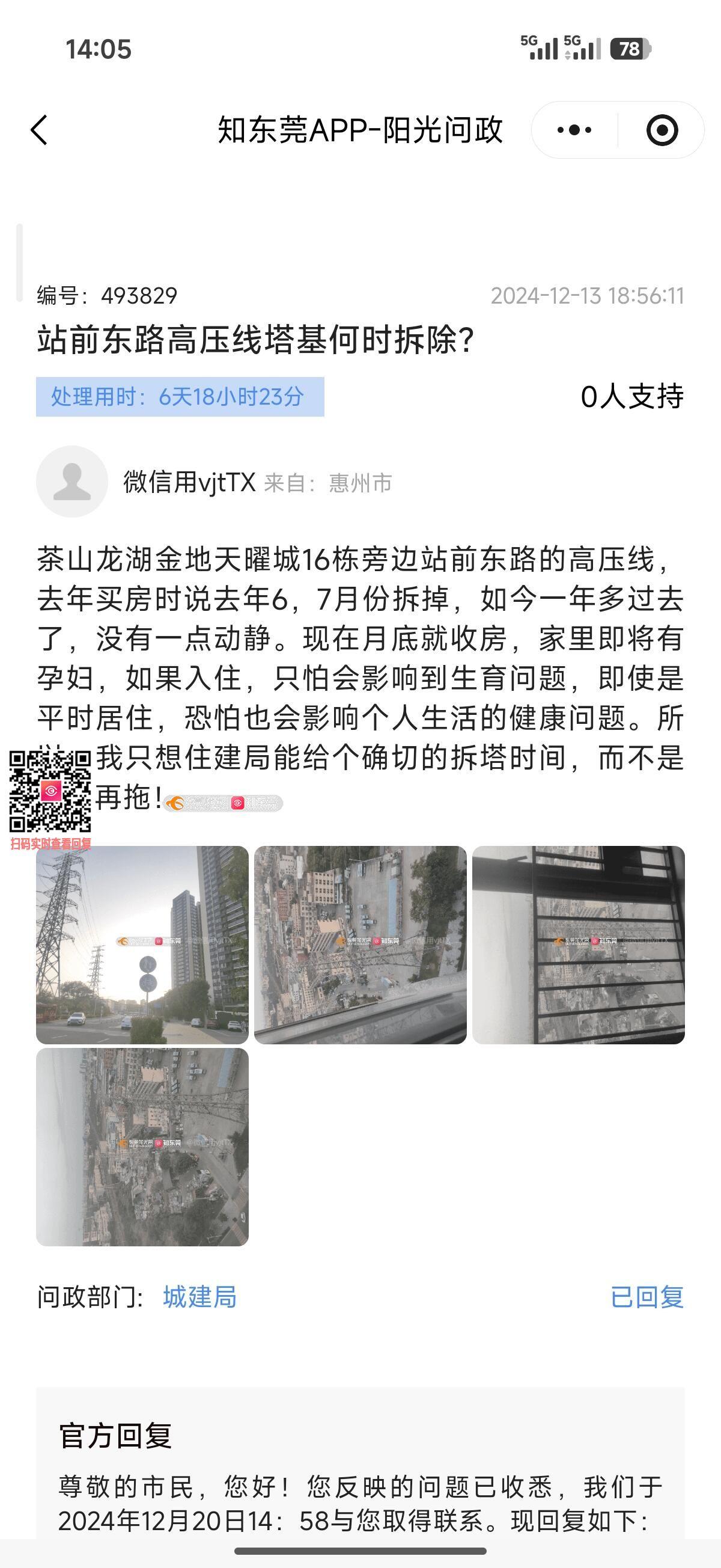 站前东路的高压线塔,从收房时的咨询,说还没协商好拆除时间,如今一年时间过了,仍然没有消息。龙湖金地地产已经把这个钱拨到茶山住建局,然后现在都没有动工,我想问,这钱哪里去了?这个懒政要执行到什么时候?
