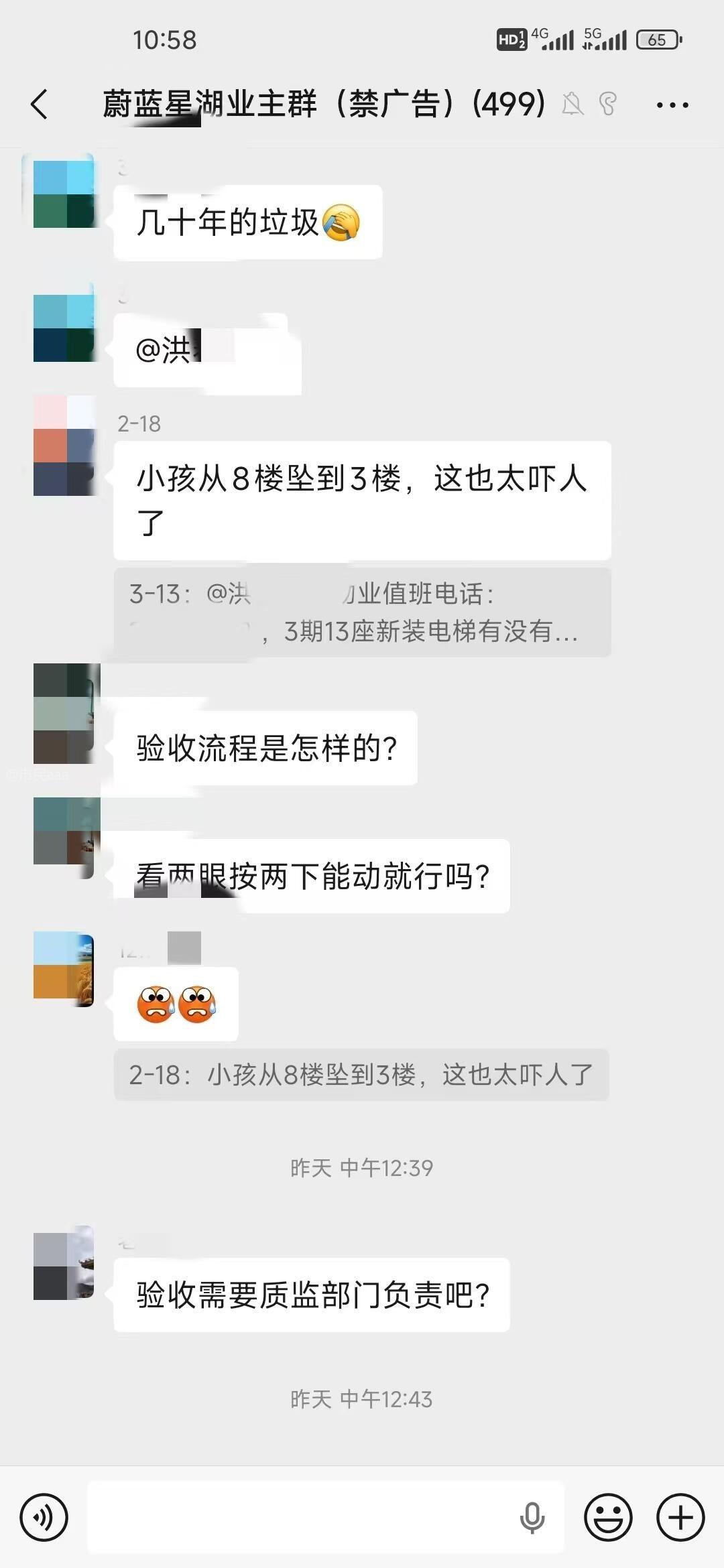 东城蔚蓝星湖小区在近期批量更换了老旧电梯,小区业主多次向物业询问关于“新更换电梯出现的坠落现象(在电梯有人的情况下从8楼坠楼至3楼)是否未经安全验收”、“新更换电梯是否经过安全验收”、“电梯底座未更换”、“新更换电梯是否有监控视频”、“新更换电梯内未设置安全扶手”等问题。小区物业工作人员视而不见,从未在业主群里向广大业主答疑解惑,造成小区业主人心惶惶。 更换电梯安全验收关乎生命安全,针对业主的多次询问,小区物业始终避而不答。请物业监管部门对蔚蓝星湖物业进行督导,让蔚蓝星湖物业对大家的疑问进行及时回答,避免生命安全事故的发生。同时,对于小区在电梯更换过程中存在的安全隐患问题,请监管部门督导小区物业即时处理。