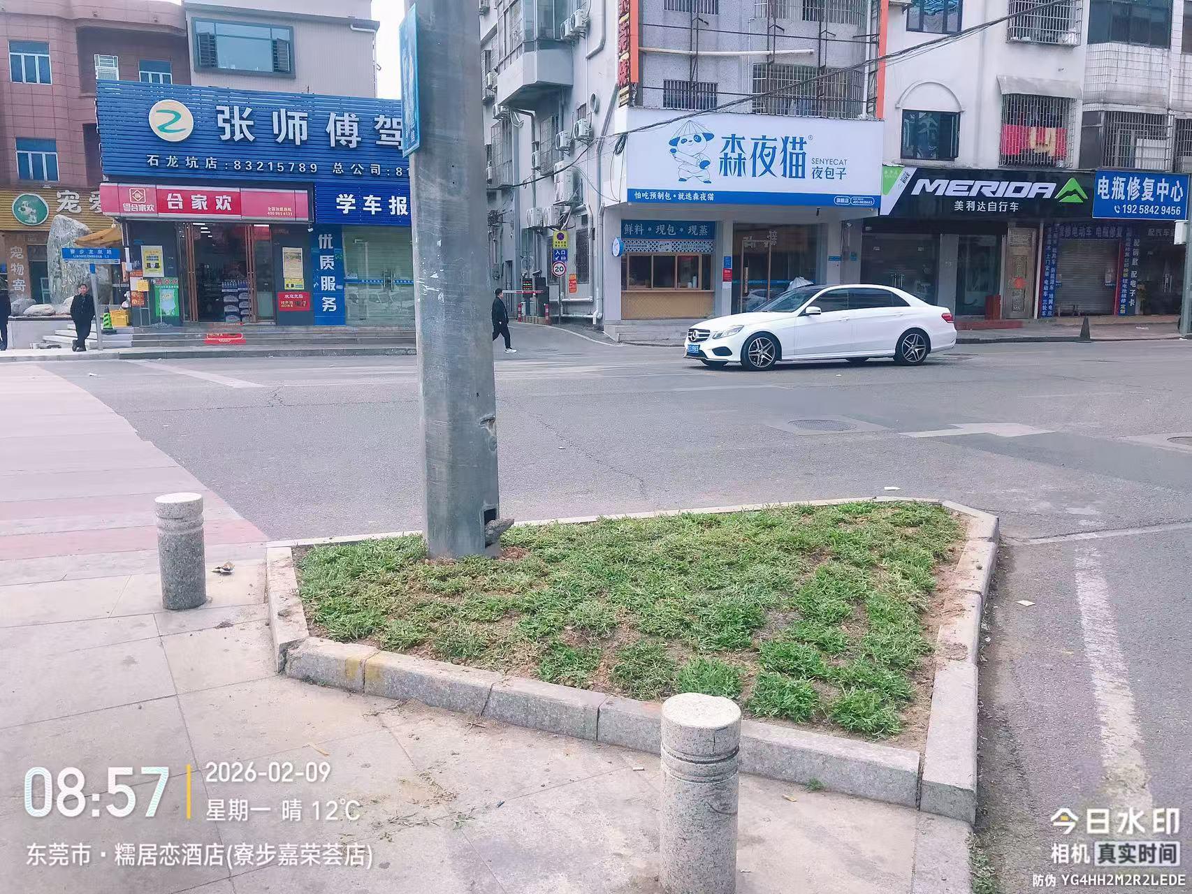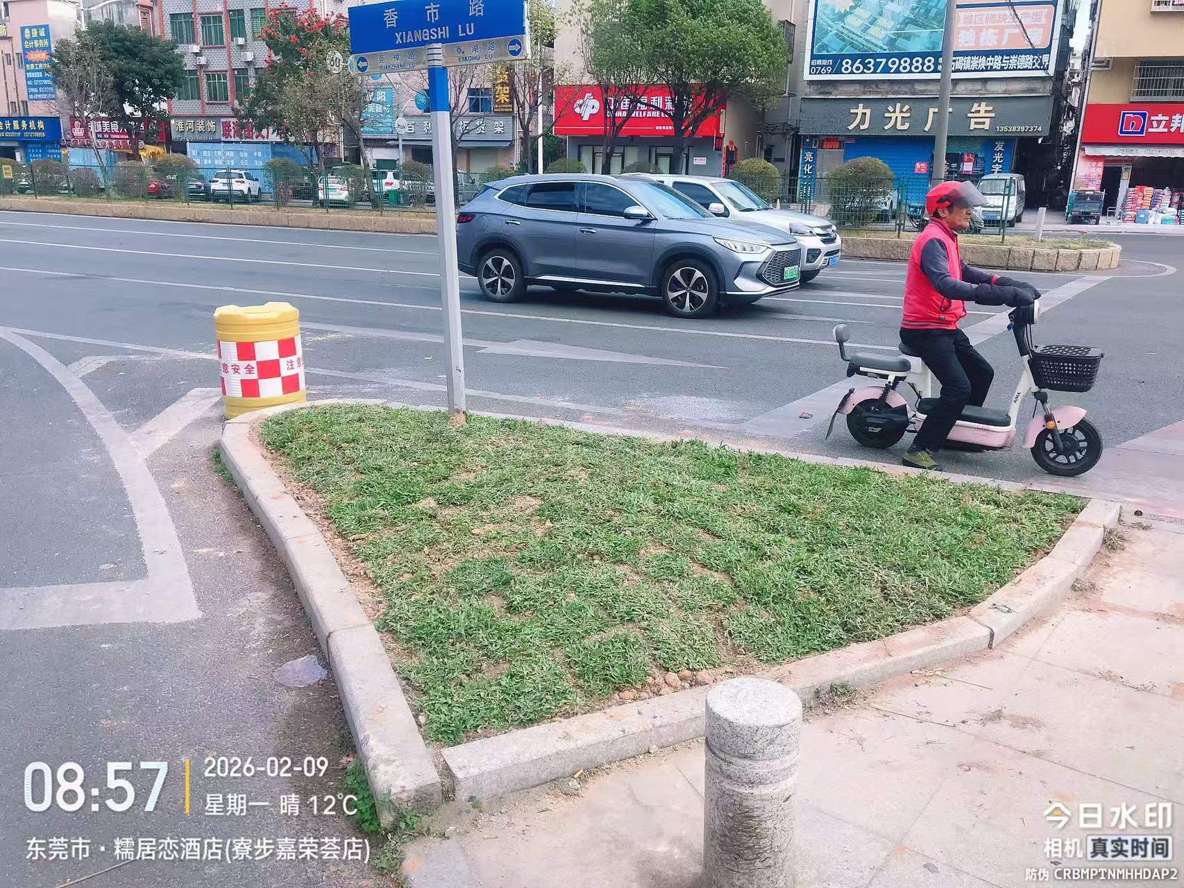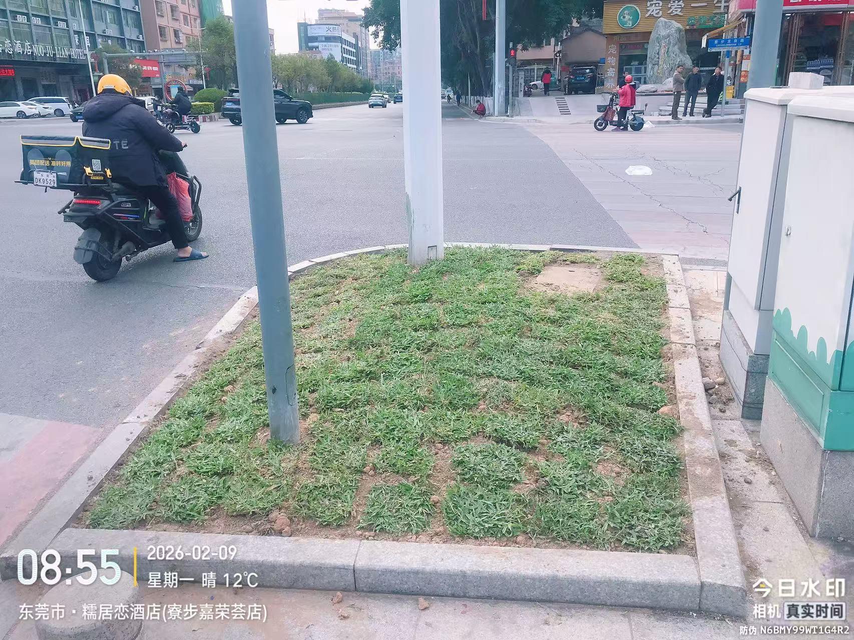 寮步镇香市路与龙泉路交界路口,右侧香市路往石龙坑方向的绿化安全岛很多狗屎和烟头,迟迟没有处理。经过恶臭,而且没有绿化。影响市容面貌