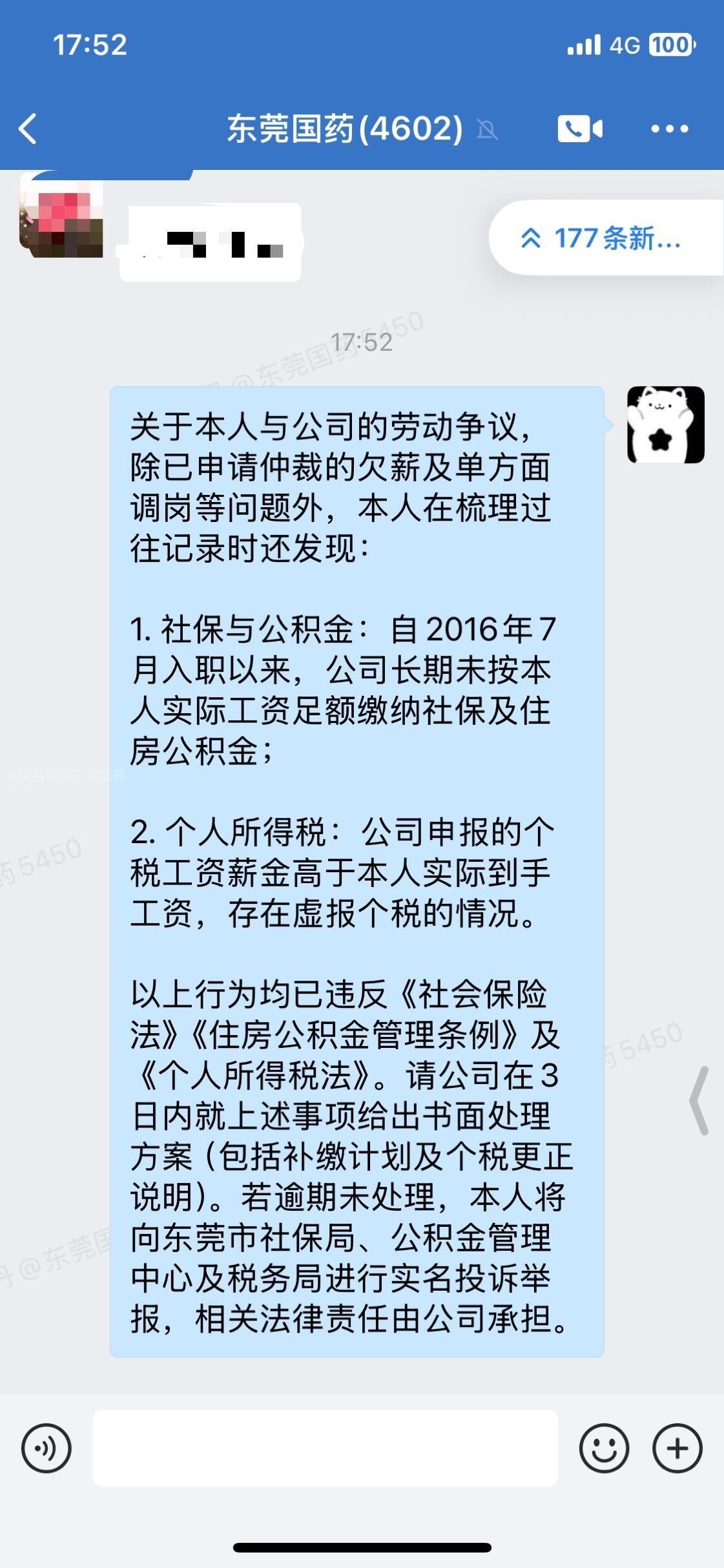 东莞国药单方面解除劳动关系,不协商不发书面通知。关于本人与东莞国药有限公司的劳动争议,除已申请仲裁的欠薪及单方面调岗等问题外,本人在梳理过往记录时还发现: 1。我在职期间,东莞国药未依法缴纳社保和公积金,未通知直接停缴社保和公积金。 2,自2016年7月入职以来,公司长期未按本人实际工资足额缴纳社保及住房公积金; 3,个人所得税:公司申报的个税工资薪金高于本人实际到手工资,存在虚报个税的情况。 以上行为均已违反《社会保险法》《住房公积金管理条例》及《个人所得税法》。 本人实名举报东莞国药, 本人:杨**,工作地址: 东莞南城白马翠园街东一巷15号宏泽药店,在反应后,东莞国药把我移除企业微信和所有微信群。东莞国药不补缴不纠正。