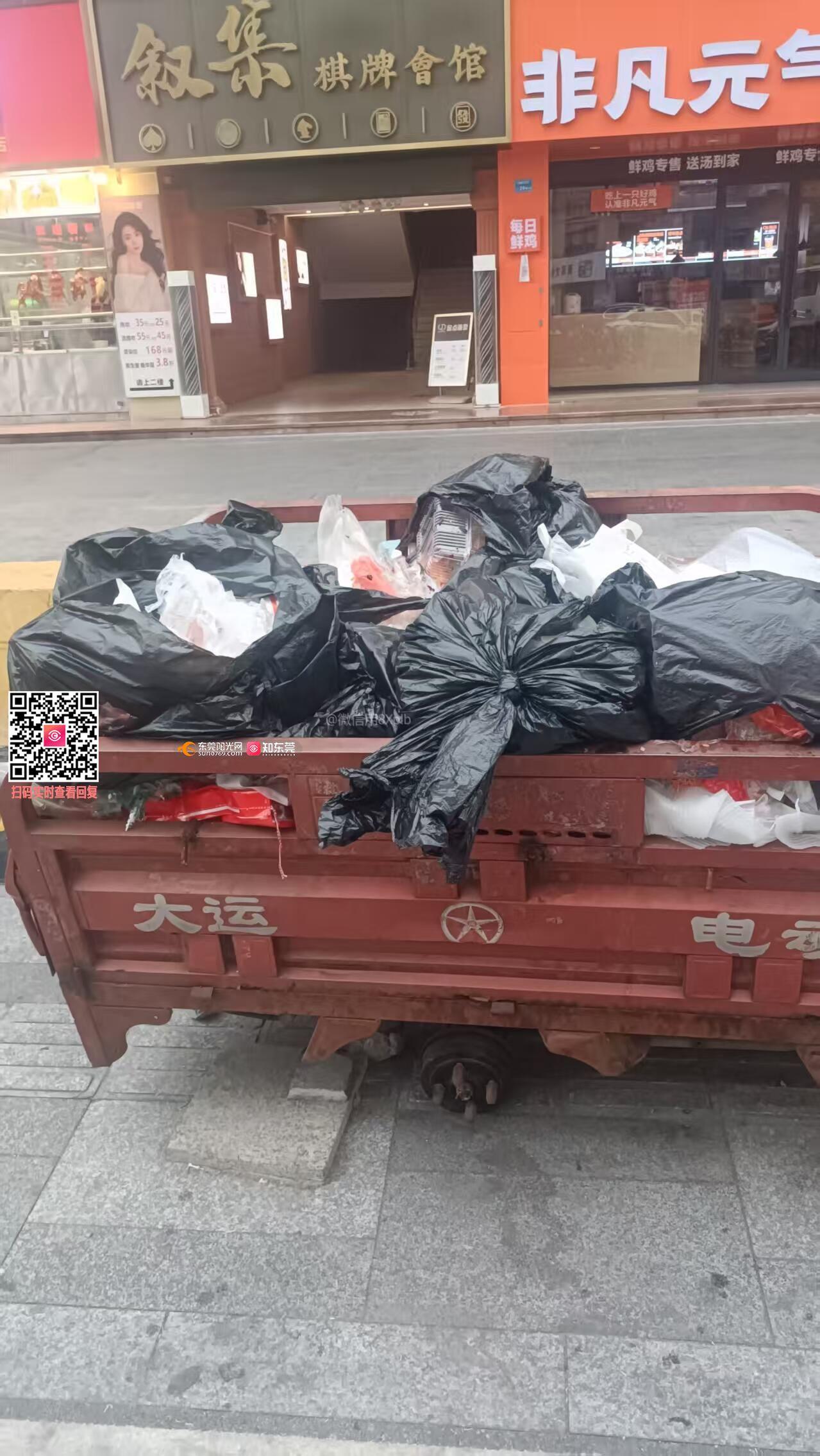 万江中心市场门前烂三轮车长期停放在门前盲道上,车厢被当成垃圾桶,堆满垃圾,散发臭味