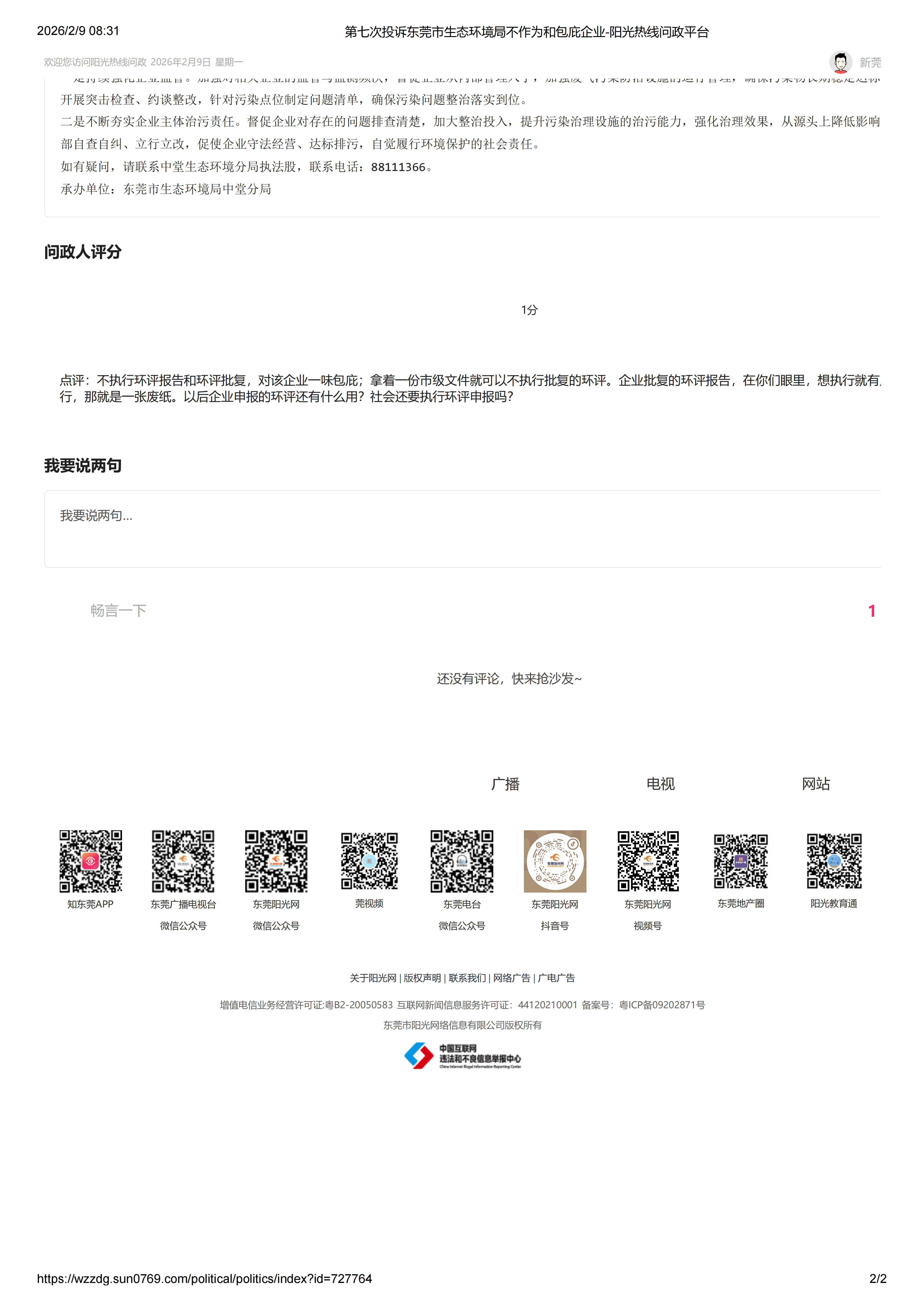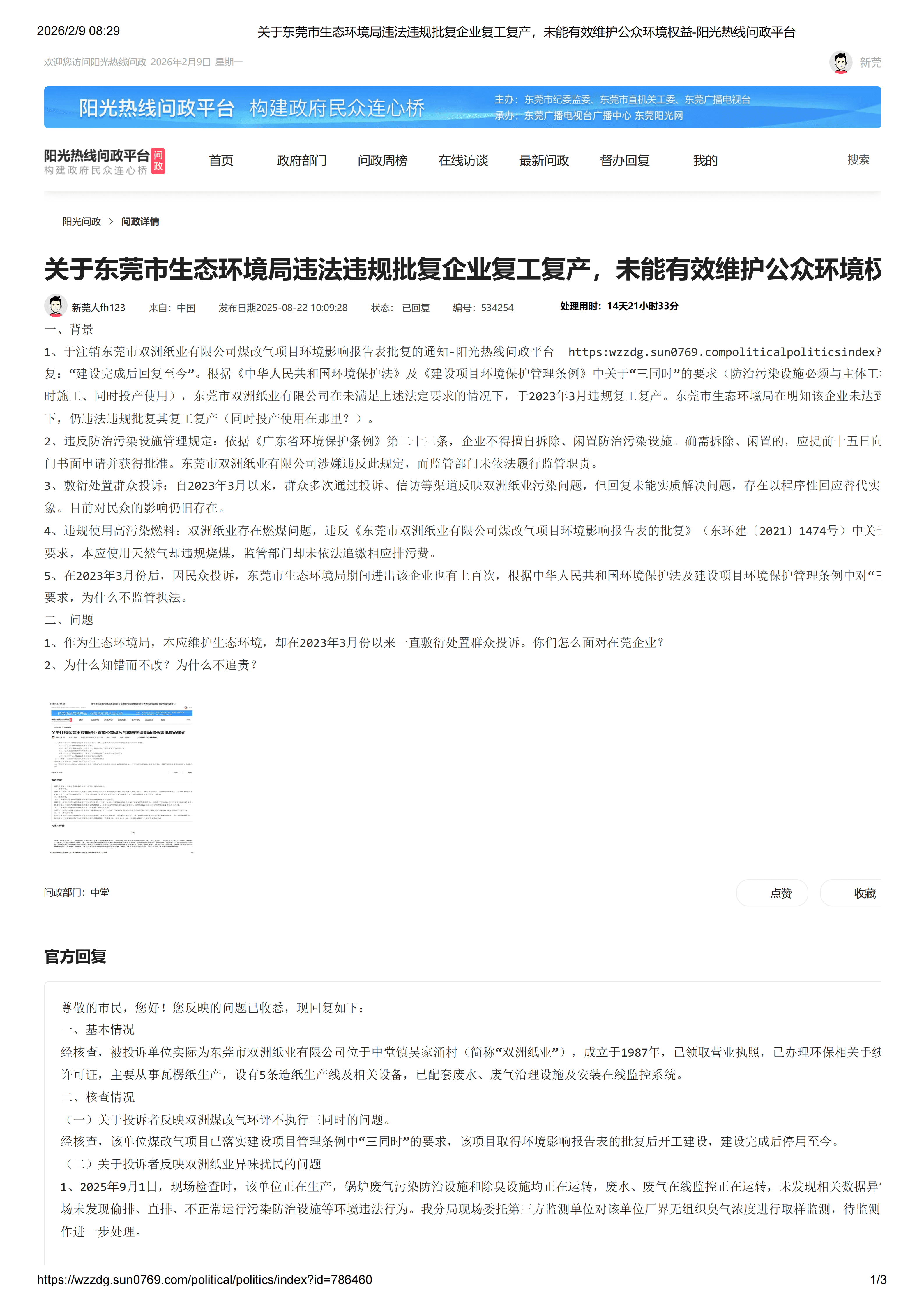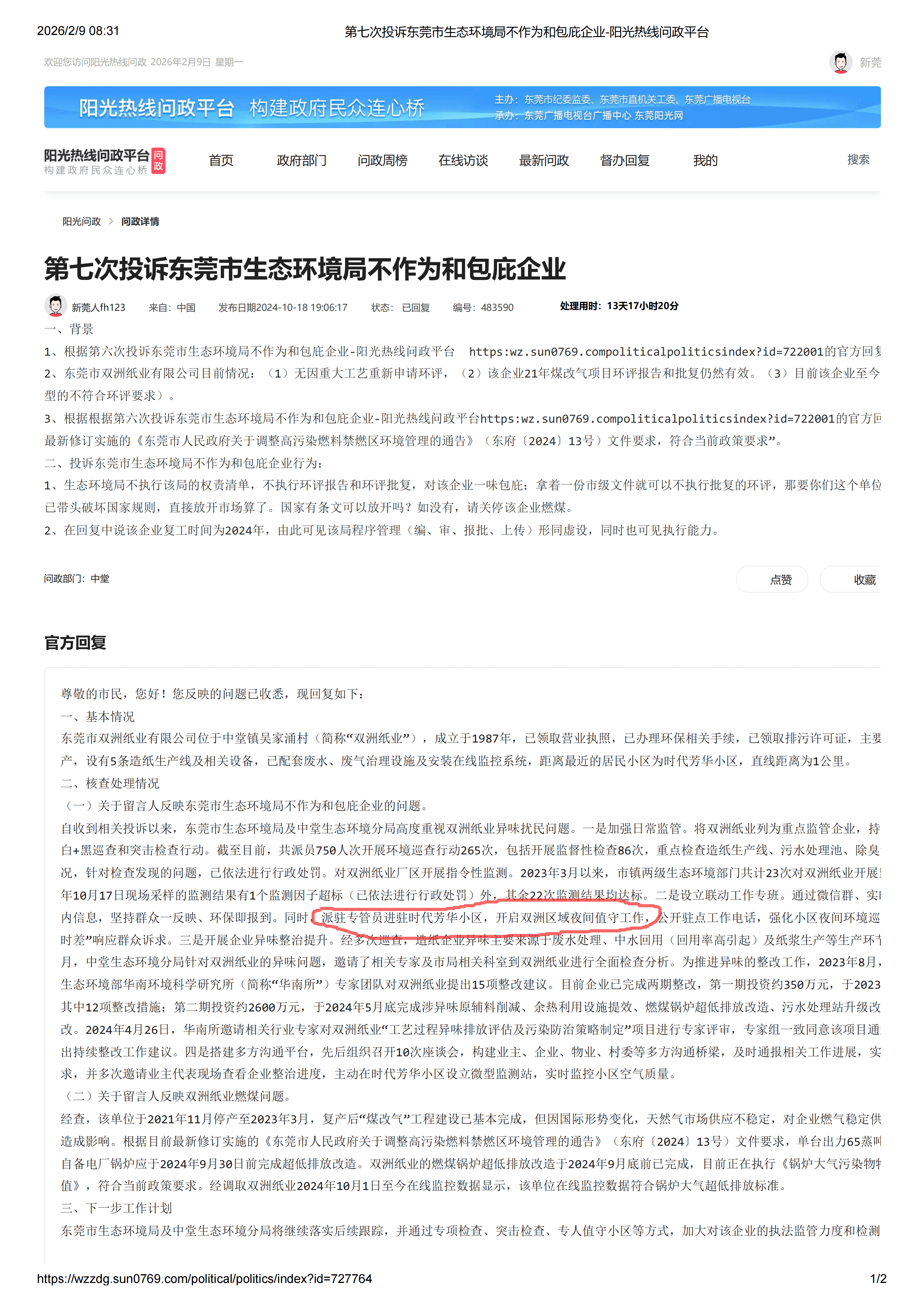 一、背景 1.根据阳光热线问政平台编号为483590的问政内容“第七次投诉东莞市生态环境局不作为和包庇企业”。 东莞市生态环境局官方回复:派驻专管员进驻时代芳华小区,开启双洲区域夜间值守工作。 2.根据阳光热线问政平台编号为534254的问政内容“关于东莞市生态环境局违法违规批复企业复工复产,未能有效维护公众环境权益”。 东莞市生态环境局官方回复:自2023年3月收到群众反映双洲纸业异味扰民问题以来,中堂镇生态环境分局高度重视,将双洲纸业列为重点监管企业,持续开展5+2、白+黑巡查和突击。截至目前,共派员1004人次开展环境巡查行动408次。 3.对于主管生态环境的东莞市生态环境局,查阅其官方网站可见诸多依法审批、迅速查处违法企业的信息。但根据该局过往对于上述企业的其他官方回复来看,就是表面粉饰太平,背后却是各种官方回复的包庇。 4.到目前,仍未解决民众问题。 二、问题 1.“派驻专管员进驻时代芳华小区,开启双洲区域夜间值守工作”,费用财政支出,还是企业支出?如果财政支出是以什么名目支出?如果企业支出,那就大家去意会了。 2.对单位一企业3年“共派员1004人次,开展环境巡查行动408次”。没问题需要派员1004人次,408次巡查,派驻专管员进驻时代芳华小区吗?对单一企业为何情愿投入巨量行政成本和资金支出,为什么宁愿包庇企业,也不愿意解决民众的问题? 3.设立主管生态环境的部门初衷是什么?观此事件,却成了官商勾结,且不惜官方各种回复包庇企业、忽悠百姓的一个部门。有这样的部门,能解决生态问题吗?