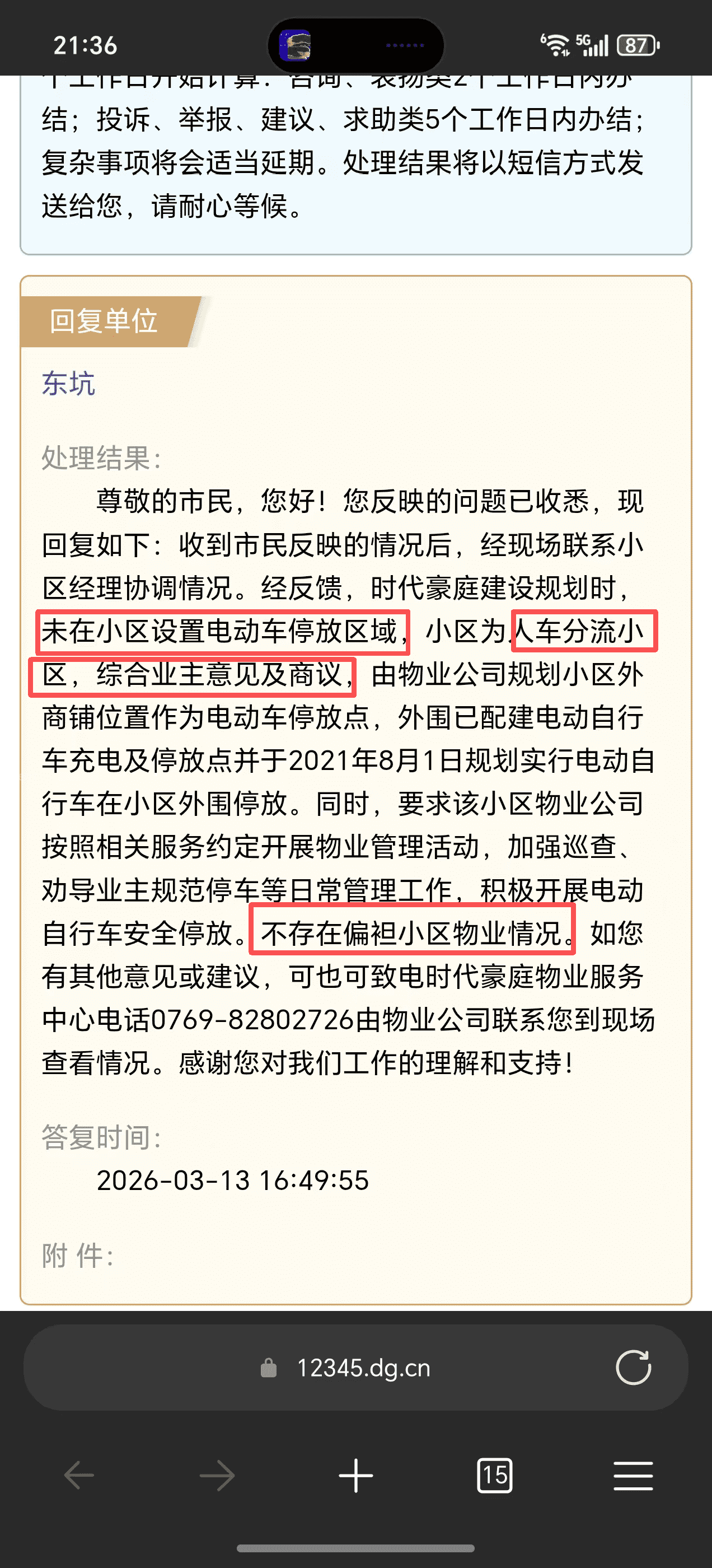 本人是中央松湖小区业主一名,发现小区正在混淆“电动车停放”和“电动车充电”的问题,忽略在电动车和机动车辆停放秩序管理上的职责义务,直接“一刀切”,禁止电动车进入小区,侵害业主合法权益,业主自有电动车无法进入小区正常停放,要求相关部门责任整改 本人在313得到东坑房管所回复,有以下几点疑问: 1.东坑房管所回复的所谓“人车分流”,根据《中华人民共和国民法典》第二百七十三条,人车分流的“车”,值得是机动车辆,而非电动自行车或是自行车,东坑房管所再一次连同物业方,企图混淆概念 2.东坑房管所回复的所谓“综合业主意见及商议”,请问物业方有无召开业主大会,通过多数业主代表,进行表决投票的形式通过禁止电动自行车小区的方案,有无形成书面记录,本人需要东坑房管所和物业方提供相应纸质记录,是否真的业主们一致同意? 3.“时代豪庭建设规划初期,未在小区设置电动车停放区域”,有无小区图纸佐证?完全无任何区域停放,目前小区每一栋楼下停放着大量的自行车辆,如果说真如东坑房管所所说无电动车停放区域,那请问这些自行车为何有地方可停?请问是否为区别对待? 4.东莞房管所全程只打了本人一个电话,约本人在工作日工作时间去物业方面谈,本人表示工作时间不方便离岗外出,询问可否安排在6:30之后,东坑房管所回复其已经下班了,之后无任何沟通记录,是否在要求东坑镇居民请假去配合东坑房管所工作人员的时间,反而不愿意加班服务人民? 本人要求讲问题升级至市住建局协调解决,东坑房管所全程在偏袒维护物业方!!!!