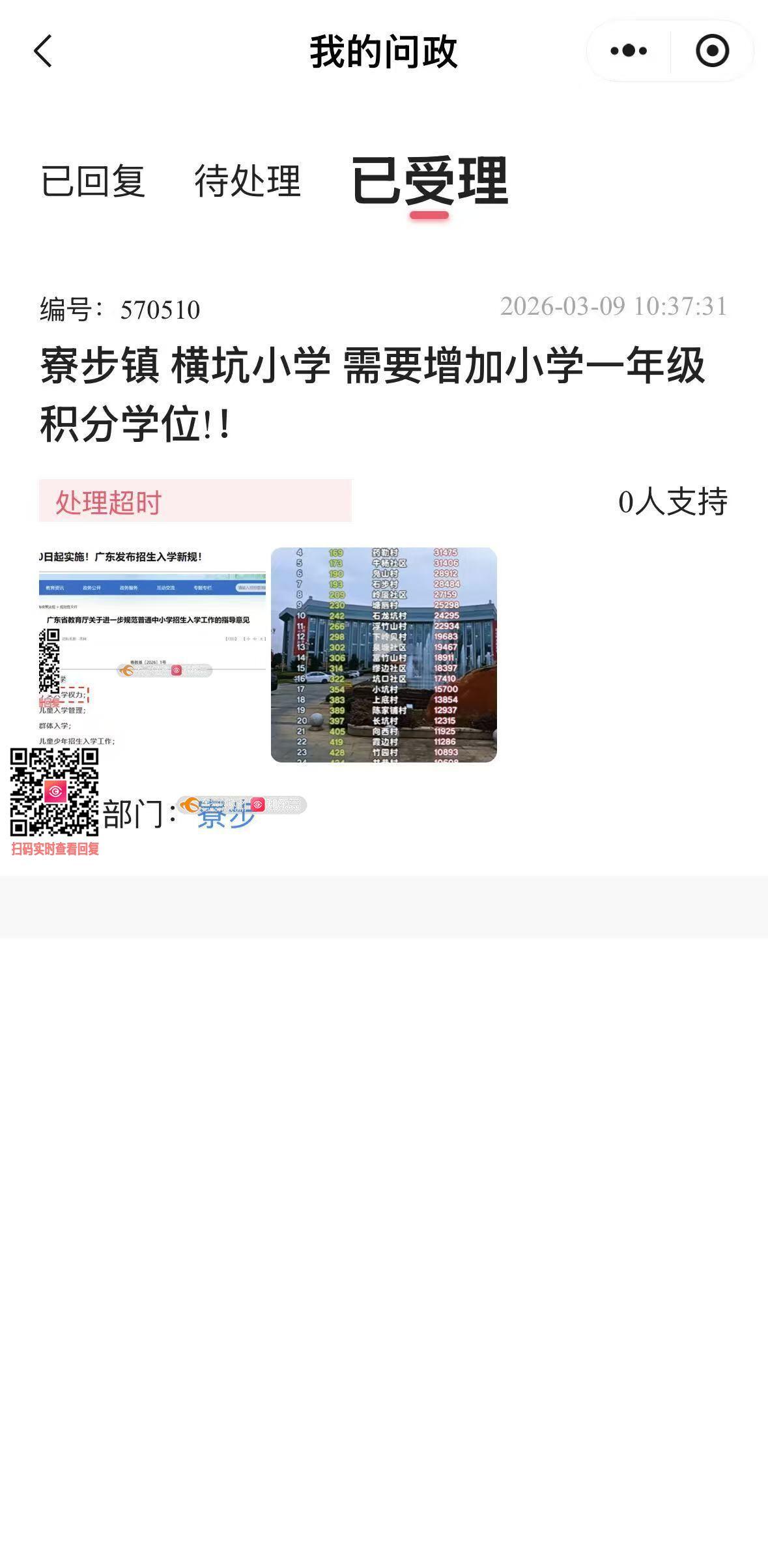 【问政现况】寮步镇横坑小学,从2019年开始连续7年,小学一年级一直没有提供积分学位. 【诉求事项】寮步镇横坑小学 2026年秋季增加小学一年级积分学位. 【国家政策指引】 2026/03/10 广东发布,要保障随迁子女的入学权利,但是我们横坑社区(横坑小学)7年来都一直没有提供积分入学的学位,随迁子女根本就没有入学公立优质小学的机会. 【问题说明】 1)寮步镇横坑社区的GDP一直都是排在寮步第一,如下是2024年的数据,横坑的发展是和外来务工人员的付出是息息相关的,外来务工人员也是对横坑的经济发展做出了巨大的贡献,希望政府能解决务工人员和随迁子女的入学问题,为随迁子女提供小学一年级积分入学的学位. 2)积分的名额分配中,有香市小学..寮步外国语小学等.但是请相关部门再核实一下,比如在竹园村或者温塘村的..距离香市和外国语小学,距离太远,加上莞樟路(横坑路段)每天都是堵车的,孩子至少早上6:10 就要起床了,严重影响孩子的睡眠和身心健康. 3)横坑小学也是经过几次扩建,现在一个年级有12个班级,600多个学位,应该给横坑社区内为社区做出努力的随迁子女提供积分学位,600多个学位中抽出7~10个学位应该不是困难的事,就是学位紧张,也应该抽出5~7个学位,解决横坑社区内外来务工人员的后顾之忧!! 4)2026/3/10 已经提出了以上诉求,但是超出了回复期限,还没有得到肯定的答复.