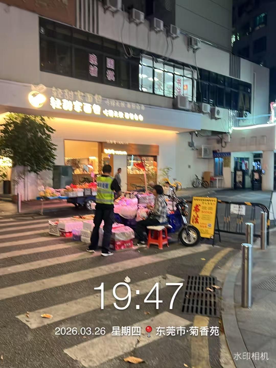 东莞市南城区稻花村南门小区出入口被摆摊的全堵住了,刚好就是小区出入口,也是阳光第四幼儿园消防通道口,人行道,车进去看不到行人,非常危险,而且也是个转弯口,经常堵着进不去,行人走路过不了,路上全是油,容易摔跤,投诉多次没用,交警也投诉过,说是城管管的,但是城管过来就叫他们推开车,拍个照片又放回去,而且他们喝酒就在门口路边撒尿,臭气熏天,这里是市中心,东莞是个文明城市,这样的执法有用吗?出事了应该找谁?