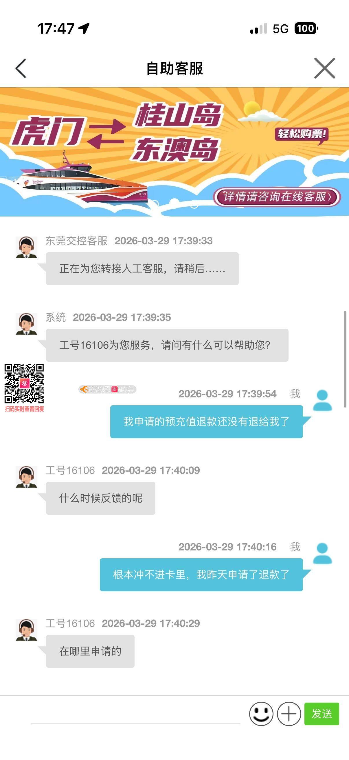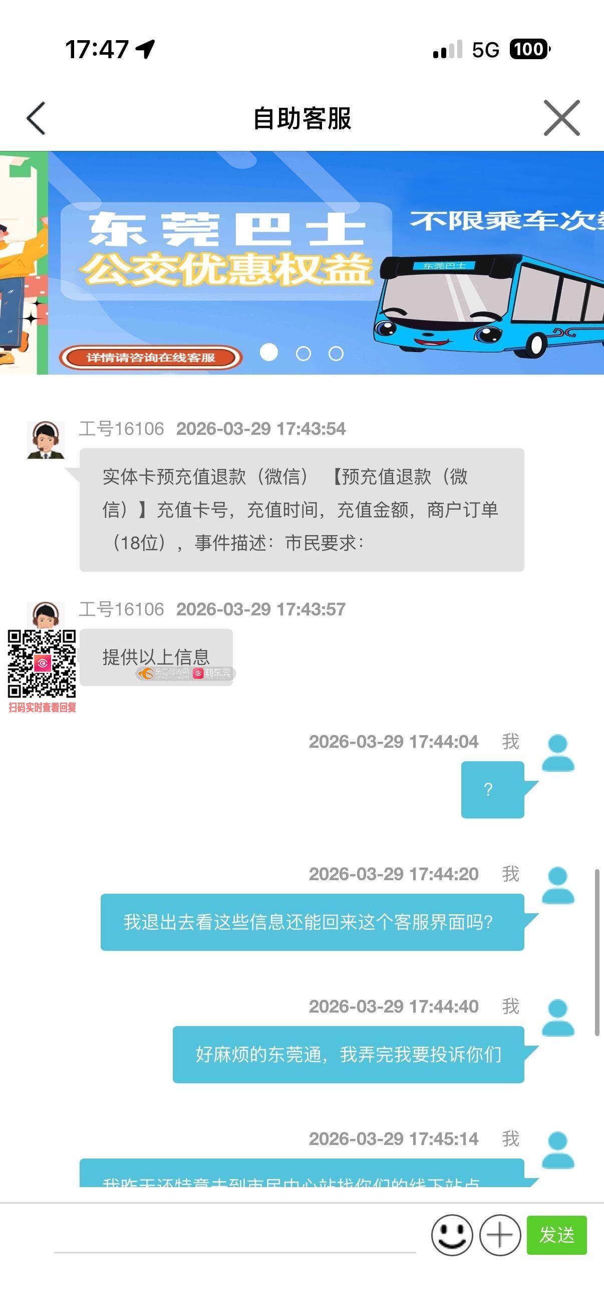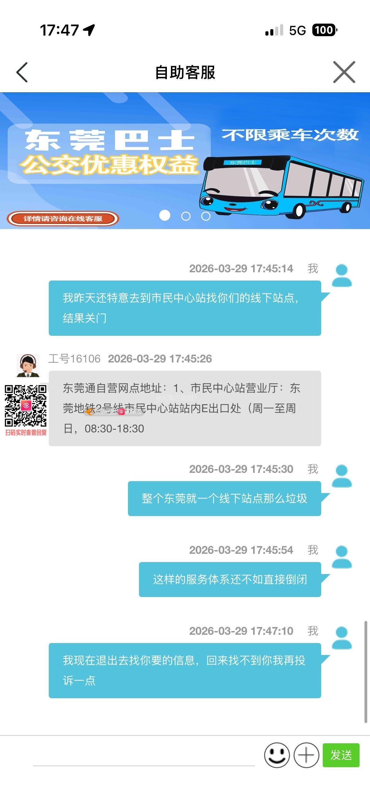 这么麻烦的东莞通,真的好吗?便民吗?这不是刁难市民吗?尤其是不会用手机充值,又没到用老人卡的老人家,要特意跑到市民中心站的线下站点去充值,那个充值点还得特意刷卡出站才能去,还经常关门!!!想自己在东莞通软件上自己充吧,还充不进去,退款还慢!客服还让提供种种资料,点出去找资料,点进来又是新的客服界面~实在不行要不倒闭停用吧