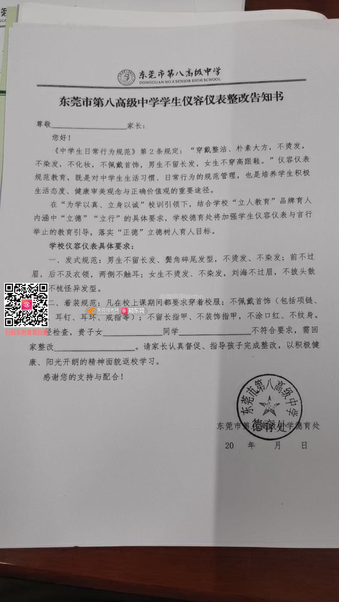 尊敬的市民: 您好!来件已收悉,感谢您对东莞教育的关注和支持。根据您反映的问题,现回复如下: 经了解,该校根据教育部《中学生日常行为规范》,结合学校实际情况制定了相关管理条例,其中男女生标准为男生短发前不覆额、侧不掩耳、后不触领,女生以束发或齐耳短发为主,旨在引导学生养成整洁得体的仪容仪表习惯。学校反馈,学校未以发型不合格为由不让学生返学,目前阶段为要求学生利用周末时间进行整改。下来,学校将深化家校协同共育,在家校沟通中争取理解与支持,共同引导学生以积极心态看待仪容仪表规范。 我局已督促学校主动听取学生和家长的意见,更充分地考虑学生需求,在规范执行过程中注重人文关怀,尊重学生个性特点,实施人性化管理。如书面回复未能解决您的疑惑,可致电学校德育处(联系电话:0769-82338007)。 东莞市教育局 2026年4月7日