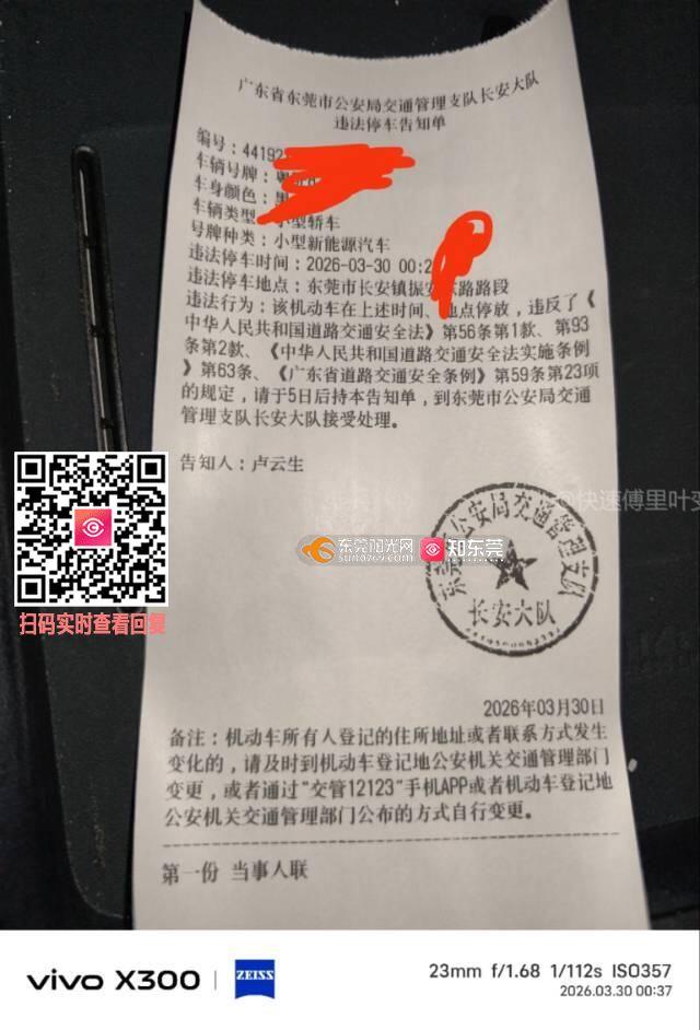 尊敬的市民,您好!您反映的问题已收悉,现回复如下:经核查,因长安辖区车流量大,道路违停情况严峻,且机动车乱停乱放,诱发电动车交通事故,存在严重的交通安全隐患,我大队警员到现场对同一时间同一路段的机动车进行教育劝导及查处,市民反映的车辆停放位置并非停车泊位,且该路段设置有禁停标志,执勤人员依法对违规停放车辆进行拍照取证、张贴违停告知单。请市民遵守交通规则,规范停放车辆。若市民对该违法有异议,可通过交管12123平台进行违法申诉,或前往交管大队现场申诉,也可到东莞市人民政府提出行政复议。我们于2026年4月3日10时58分回访市民称:告知市民上述情况,市民表示知悉。如有疑问,请联系东莞市公安局交通管理支队长安大队,联系电话:81661611。感谢您对我们工作的理解和支持!承办单位:东莞市公安局长安分局。