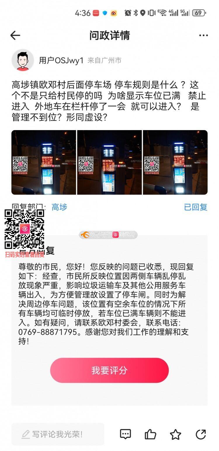 高埗镇欧邓村 村后面停车场 停车准入问题 之前 反映的就是准入问题 你们回复所说的车位满 车辆不能进入 就是答非所问 现在就是闸口显示车位已满 但是车辆稍停 一下就能进入 请严谨对待 是否系统有问题 还是人为 操作 让车辆进入 做事不要说一套 做一套 你们平时已经没啥事做了 一道停车闸口都管不好