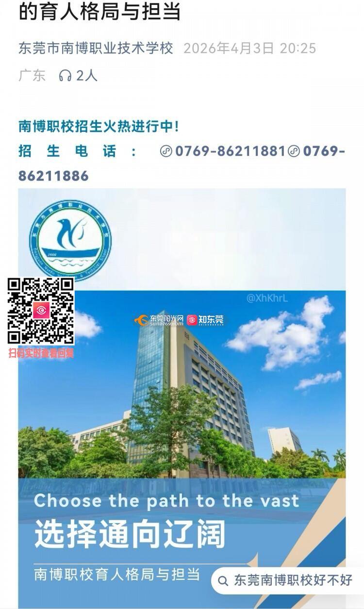 近日,东莞市南博职业技术学校多名在校学生在极短时间内,于个人微信朋友圈集中发布该校招生推文(推文标题“每一种选择都通向辽阔”,内含招生电话及商业推广信息)。这些朋友圈发布时间高度趋同、内容完全一致,呈现明显的行政指令或任务摊派特征,绝非学生自发的网络分享行为。 古语云:“酒香不怕巷子深。” 一所真正有底气的学校,凭借的是过硬的教学质量、扎实的师资建设和社会各界的口口相传,口碑自然会吸引生源。南博职校如此兴师动众,不惜动用行政手段,将学生的私人社交空间异化为学校零成本的广告渠道,恰恰暴露了其在正规招生渠道上的乏力和对自身教学质量的不自信——只有劣酒,才需要满大街堵着人灌。 学生的朋友圈是私人社交空间,学校以行政手段要求学生为商业宣传背书,已涉嫌侵犯学生的个人自由和隐私权。若辅以纪律处分或评优施压相要挟,则是对学生意志自由的变相限制,严重违背了教育立德树人的根本宗旨。 近年来,南博职校相关问题在问政平台上屡见不鲜。此前就有投诉反映该校校服抄袭、管理混乱、手机管理“有宣传无制度”、基础生活设施不足等问题,投诉长期未见实质性推进。如今又在招生宣传上动起了“歪脑筋”——教学质量提不上去,就让学生来凑数。请问南城教育管理中心:该校教学质量如何?管理是否规范?若这些基本问题都没做好,即便全校学生集体刷屏,又能掩盖什么?