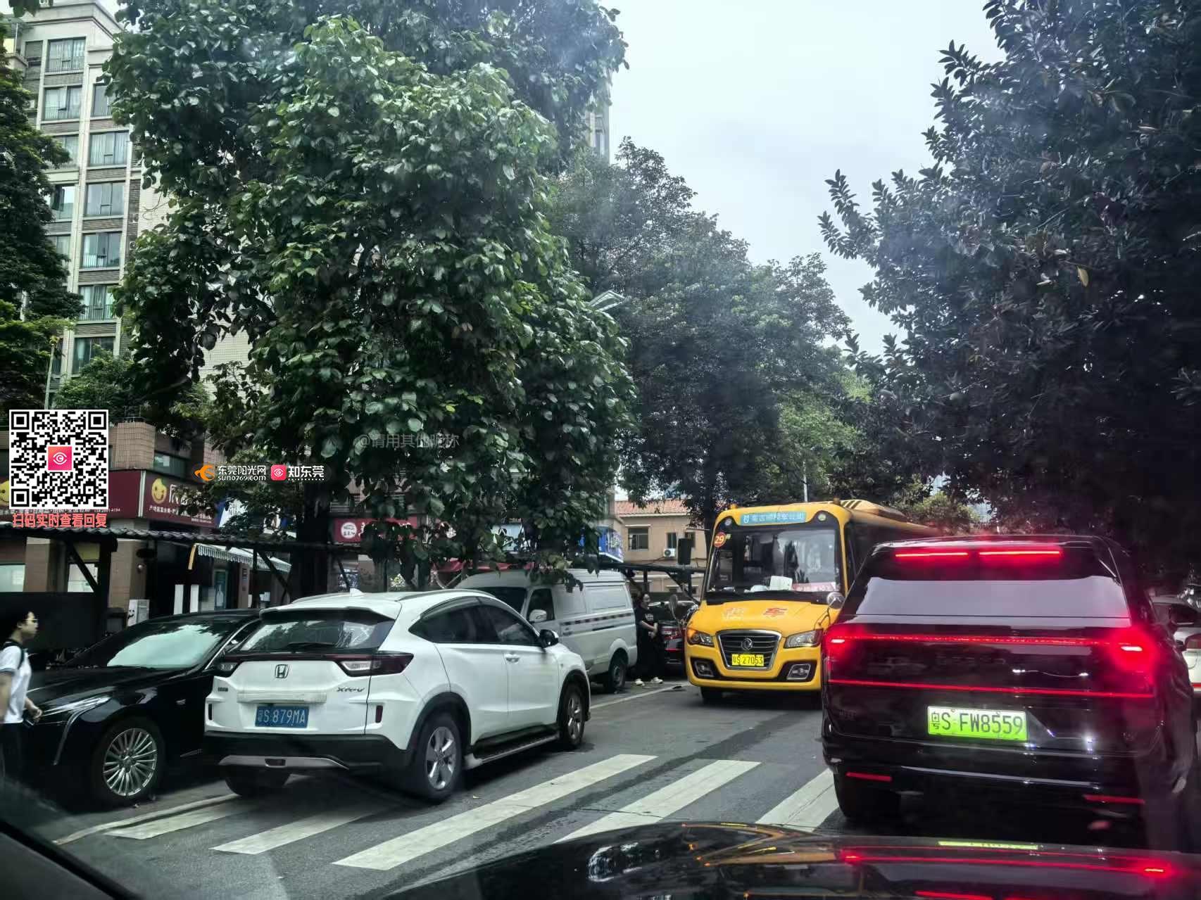 日期:2026年4月8日早上 违停路段:东莞市寮步镇松溪路【丰泰城三区北门】 违停导致校车跟社会车辆堵死,小孩上学迟到 请交警大队对粤S879MA违法行为进行处罚。